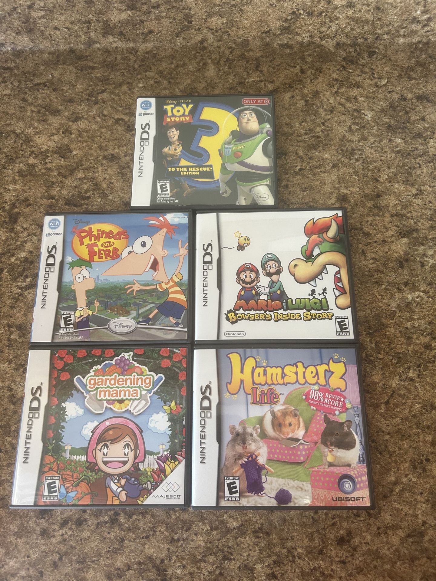 10/10 condition Nintendo ds Games Included: • Mario & Luigi • Gardening Mama – The fun outdoor spin-off from the Cooking Mama series. • Toy Story 3 – Great movie-based platformer. • Phineas and Ferb – Based on the hit Disney show • Hamsterz Life BUNDLE DEAL(everything)- $60 EACH: Mario & Luigi: $35 • Gardening Mama: $15 • Toy Story 3-$8 • Phineas and Ferb-$8