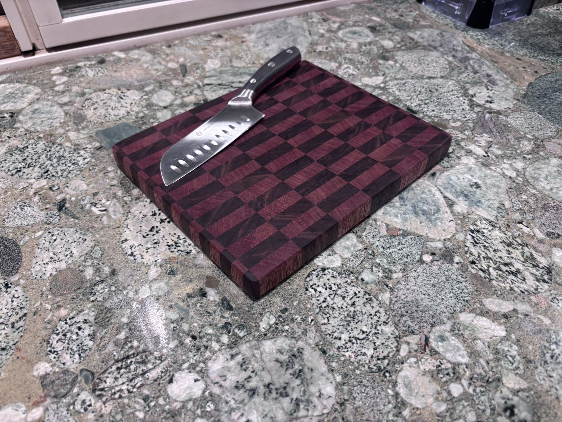 Handcrafted end-grain hardwood cutting board featuring a rich, checkered pattern in deep red and dark wood tones. Durable, knife-friendly, and perfect for everyday prep or serving. End grain style keeps knifes sharper for longer. Built with Walnut and Dark red mahogany.
