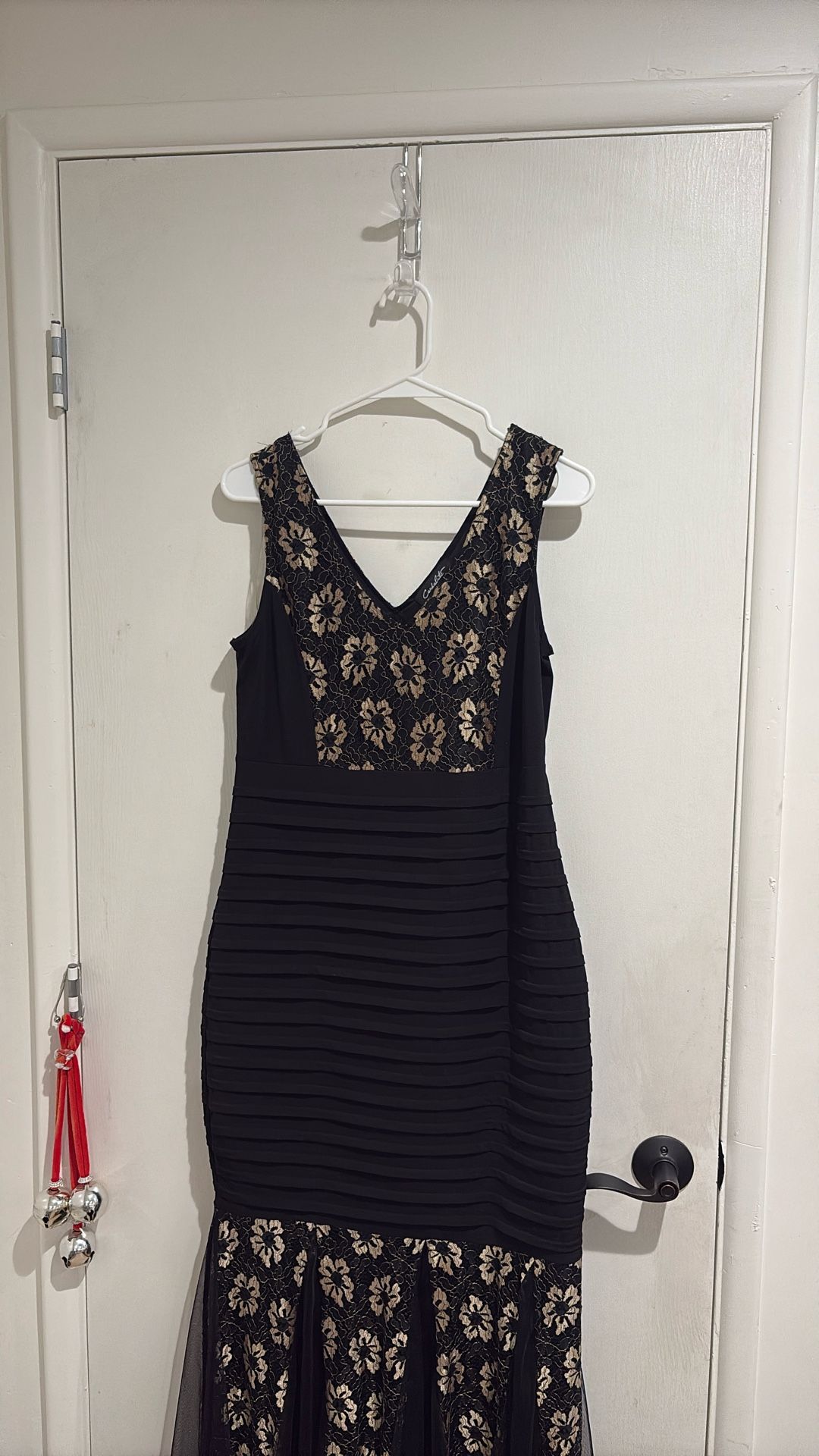 This is a Candalite Women’s Sleeveless Black & Gold Lace Mermaid Gown Beautiful trim, texture, lace and flare. Near Central and Bethany Home Happy New Year vintage glam. New never worn Designer Glamour Vintage Holiday wear Special occasion