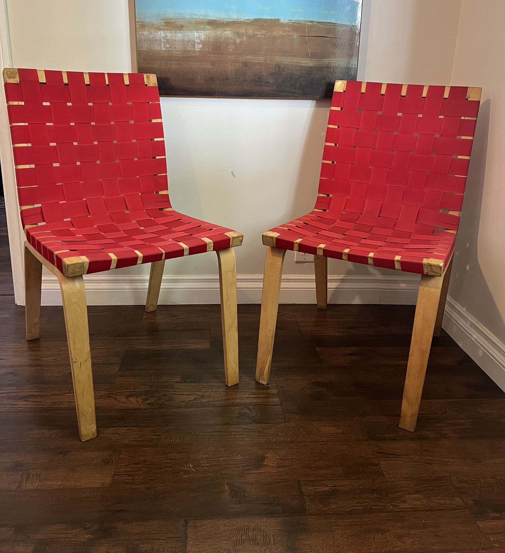 Bold, sculptural, and design-forward. Set of two modern woven strap chairs with solid wood frames and vibrant red woven seats and backs. These make a statement in a dining space, office, creative studio, or as accent chairs. The woven construction gives them both visual texture and comfortable support. Details: • Height: 33.5” (top to bottom) • Seat height: 18” • Solid wood frame • Red woven strap seat & back • Sold as a pair They have a strong architectural presence and photograph beautifully. Perfect if you love modern, Scandinavian, or curated eclectic interiors. Condition: Structurally solid. Some visible wear on the wood consistent with use (see photos), but overall very good and fully functional. Woven straps are intact and supportive. These are not big-box chairs, they have personality and presence. Serious inquiries only. Delivery available.