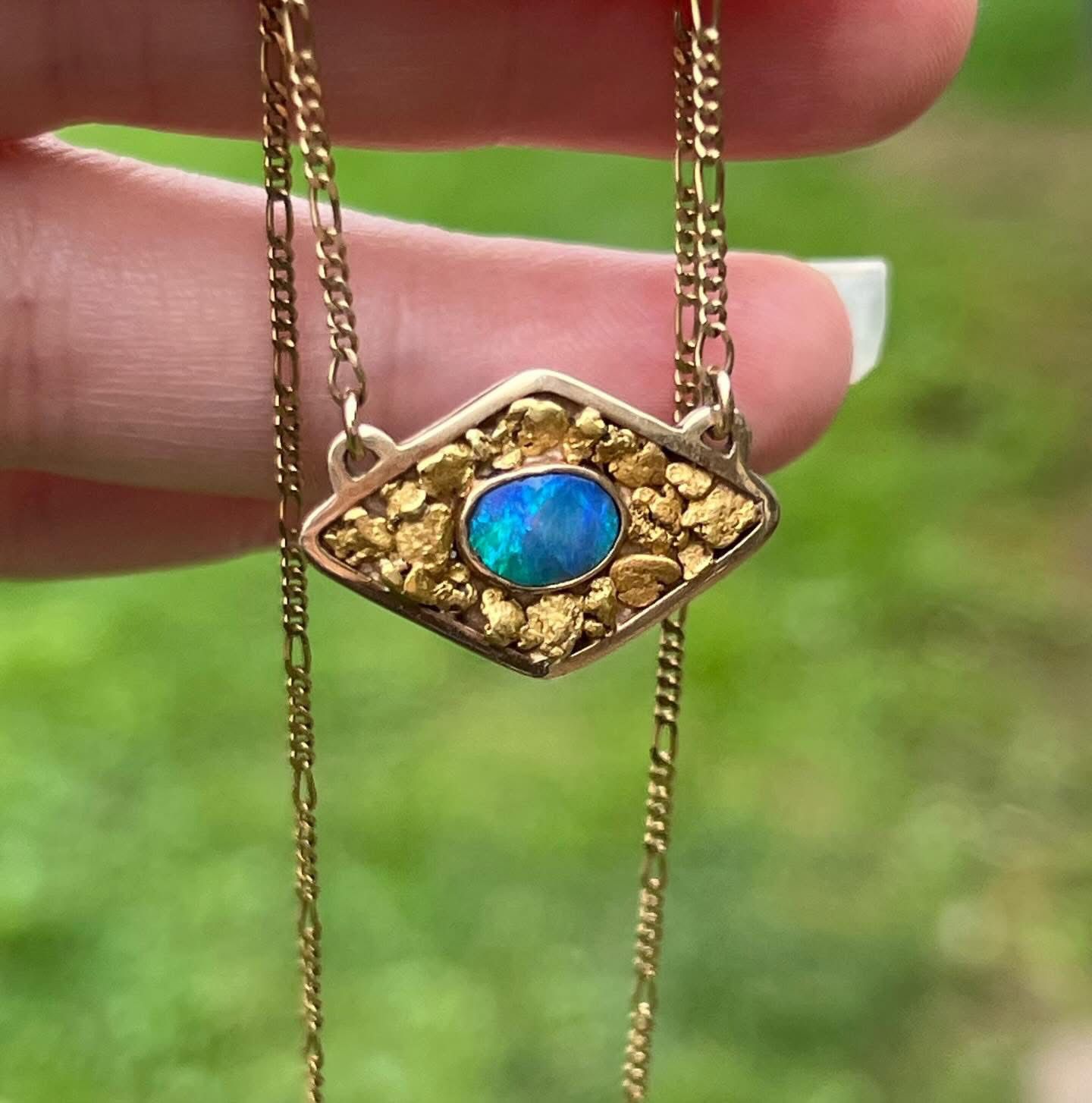 I have a beautiful custom made women’s necklace, it is solid 14k yellow gold with 24k nuggets and natural high quality blue opal center stone, the chain is Figaro link, very nice one of a kind piece, the weight is 6.5 grams. 1st $1000 firm can have it , message me if you are seriously interested, thanks.