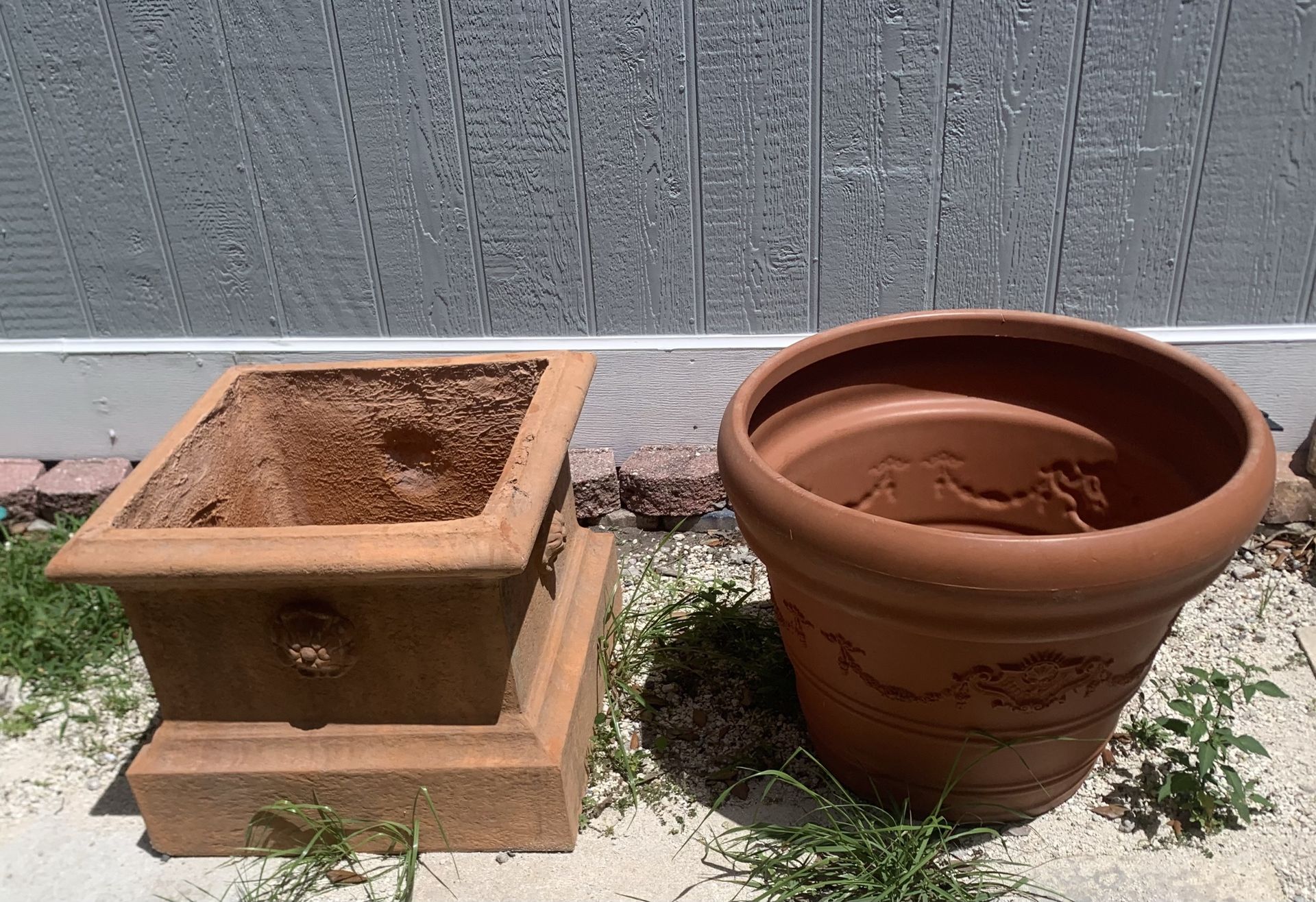 2 Very large Faux terracotta flower pots Large square planter is high quality fiberglass made to look like high end terracotta. Never used and very heavy to move. Large plastic decorative flower pot never used in great condition Both for $200 Located in 32828 Oversized Faux Terracotta Planter Pots