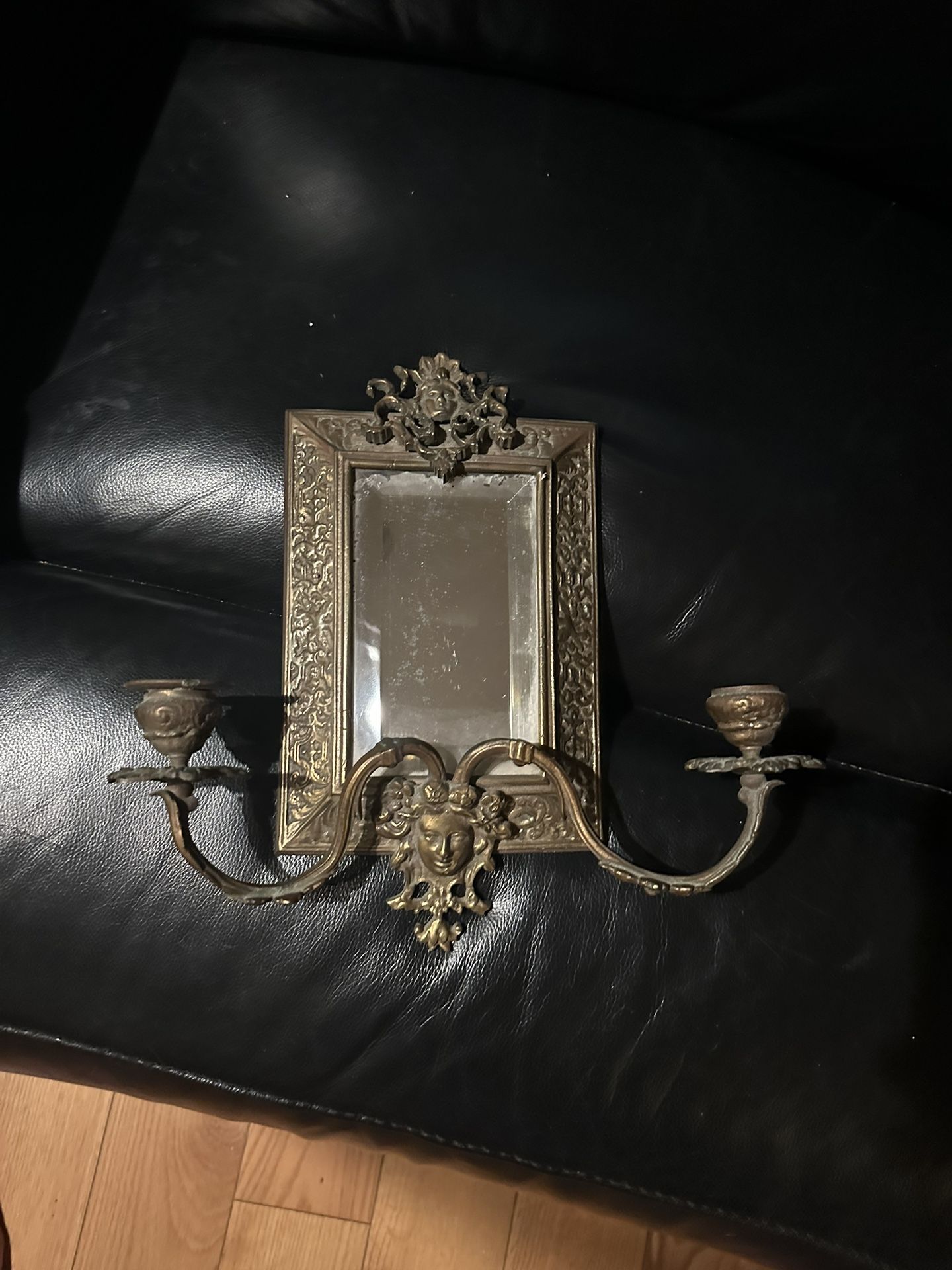 This features a central mirror with brass ornate detailing, including a face motif and is flanked by two candle holders. Likely from the 19 th century and exemplifies styles such as Baroque, Rococo, or Victorian, possibly of French origin. Have only one.