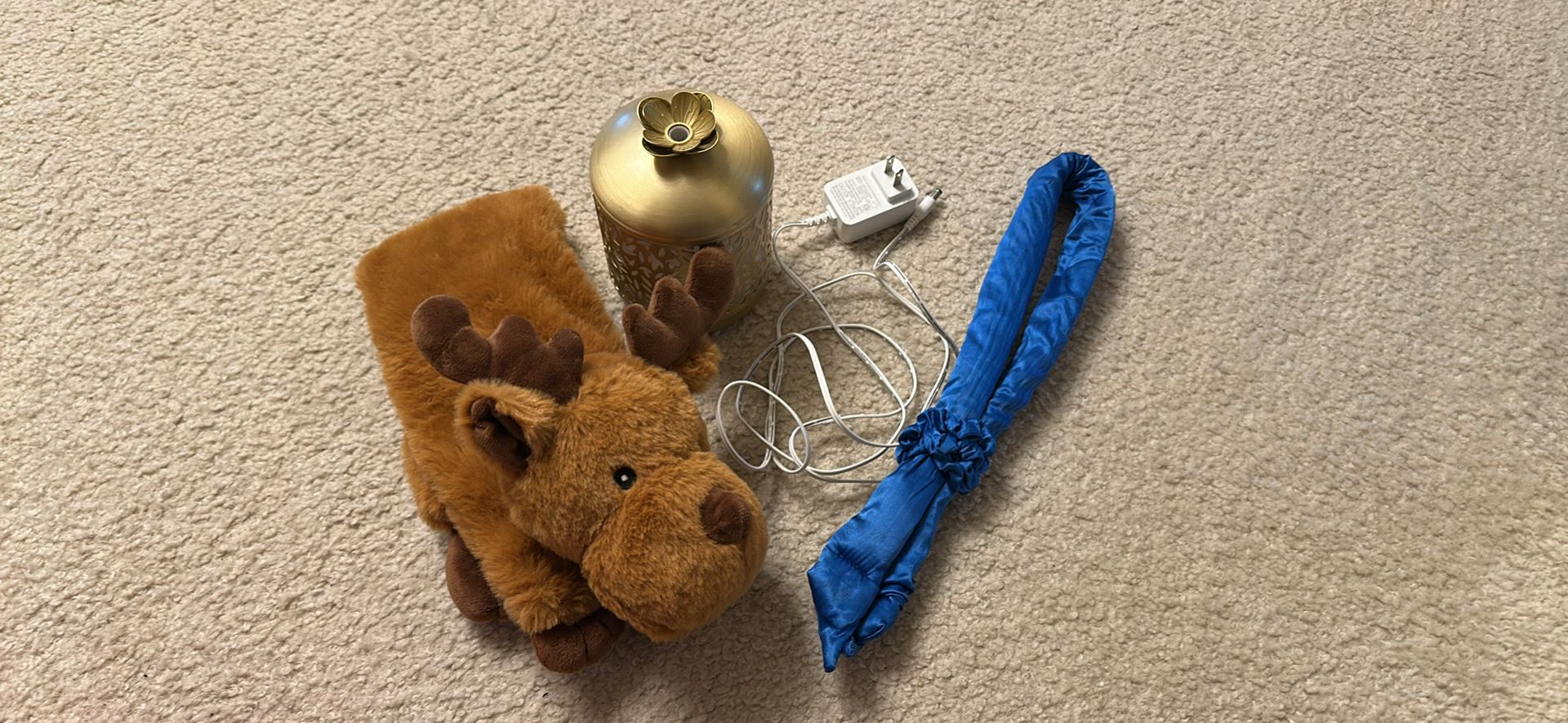 Includes a fuzzy moose microwaveable heating pad infused with lavender essential oil, a silk heatless curler, and small diffuser with led lights. Must buy as a set. OBO