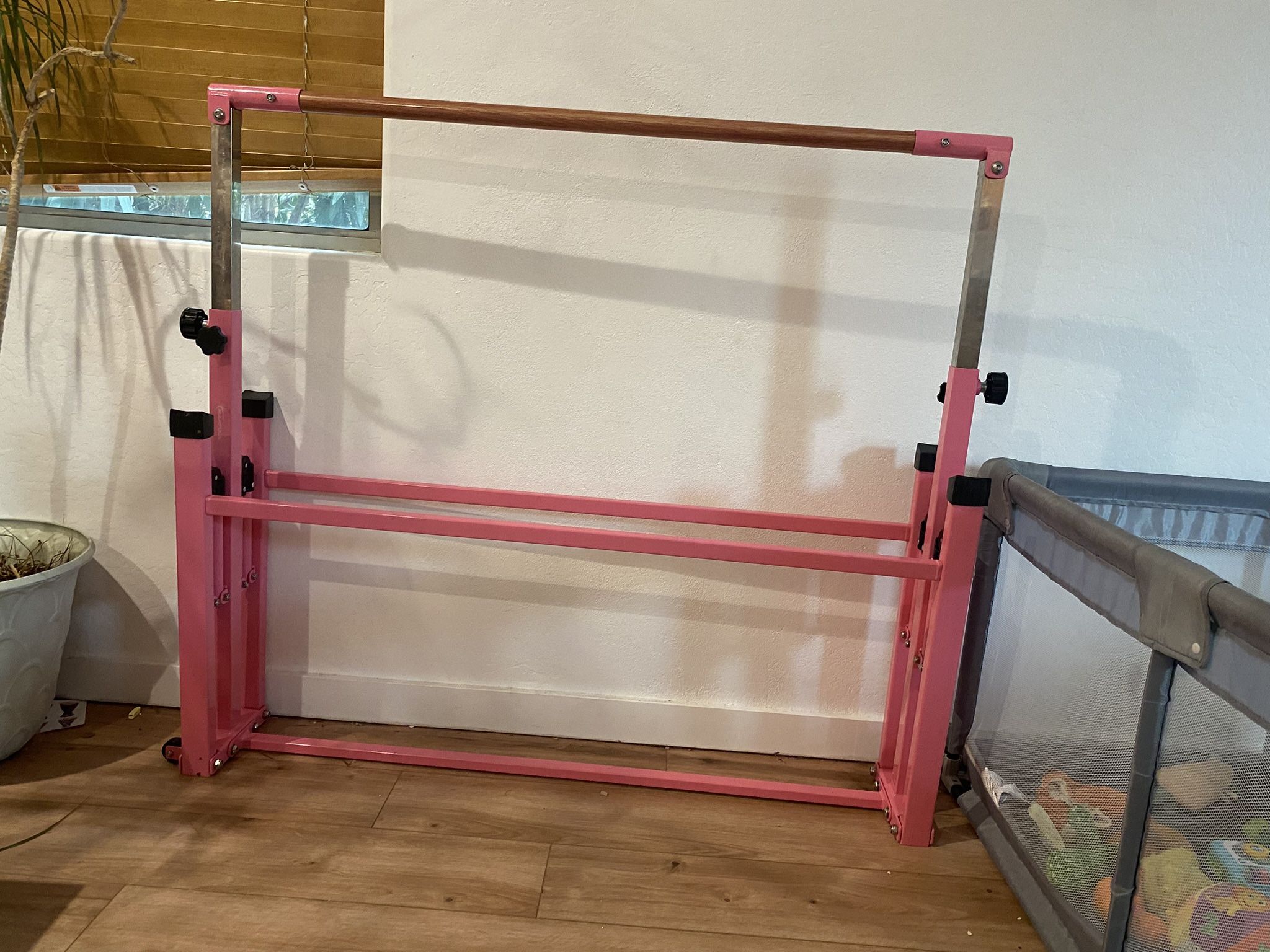Pink Foldable Gymnastics Bar with adjustable height. Great for at home gymnastics!