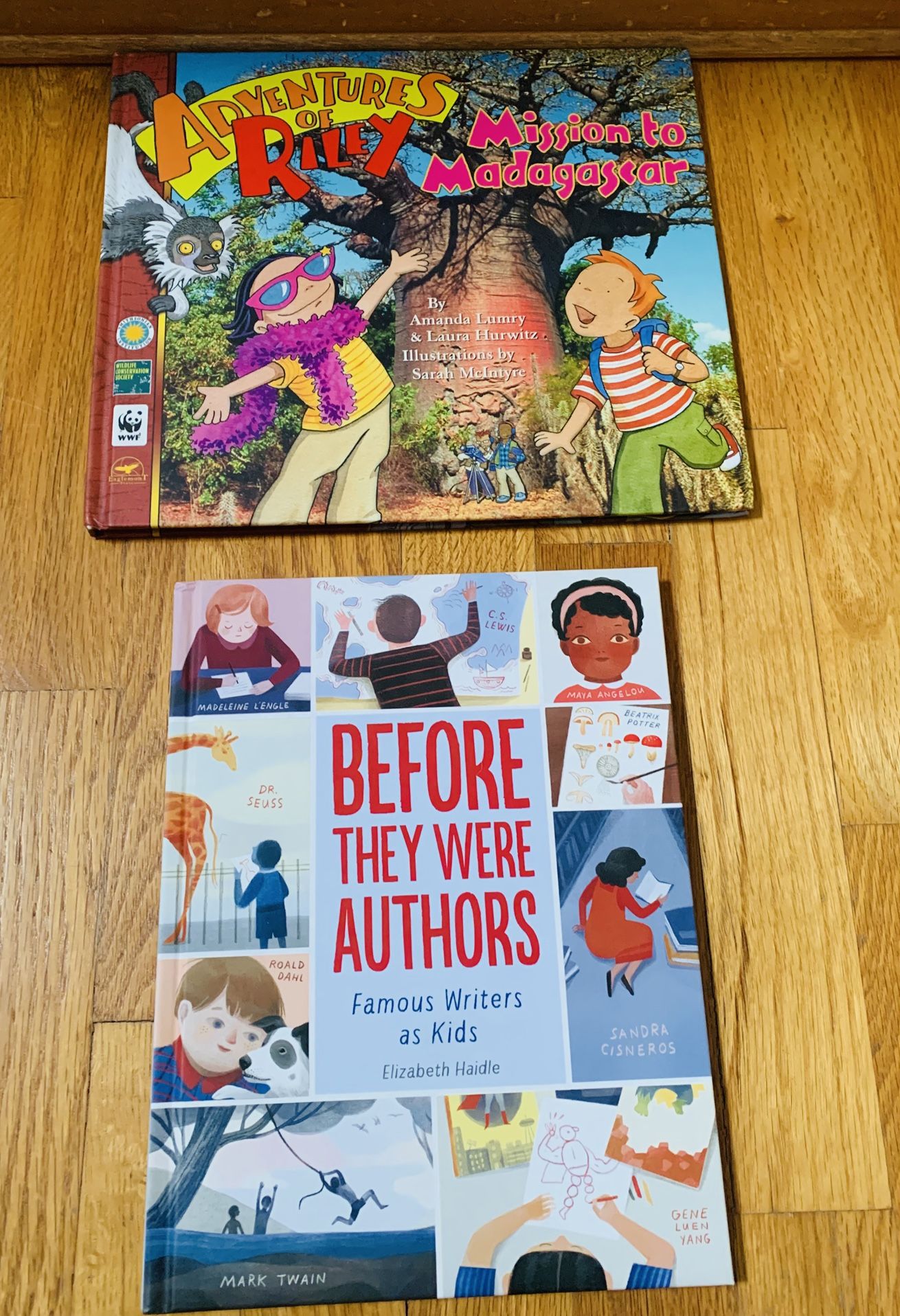 NEW Adventures of Riley: Mission to Madagascar' and 'Before They Were Authors' Kid’s Book Bundle Large Hardcover , Books retail for $32 * Adventures of Riley: Mission to Madagascar is an award-winning book from a series that blends fiction, non-fiction, photography, and illustrations to teach children about conservation. * The story follows a 9-year-old boy named Riley, his cousin, and his biologist aunt and uncle as they travel to Madagascar to search for the elusive aye-aye lemur. * Before They Were Authors: Famous Writers as Kids features illustrations and stories about the childhoods of famous writers, including C.S. Lewis, Maya Angelou, Dr. Seuss, and Sandra Cisneros. * Both books use engaging illustrations to make educational topics accessible and interesting for young readers. * The book is a collective graphic biography that explores the childhood stories and early inspirations of 10 famous authors. * Featured authors include Mark Twain, Maya Angelou, Dr. Seuss, Roald Dahl, and Sandra Cisneros. * It is designed to inspire young readers by showing that even well-known authors faced challenges and failures before becoming successful. * The book combines illustrations with factual snippets and a timeline of each author's life.
