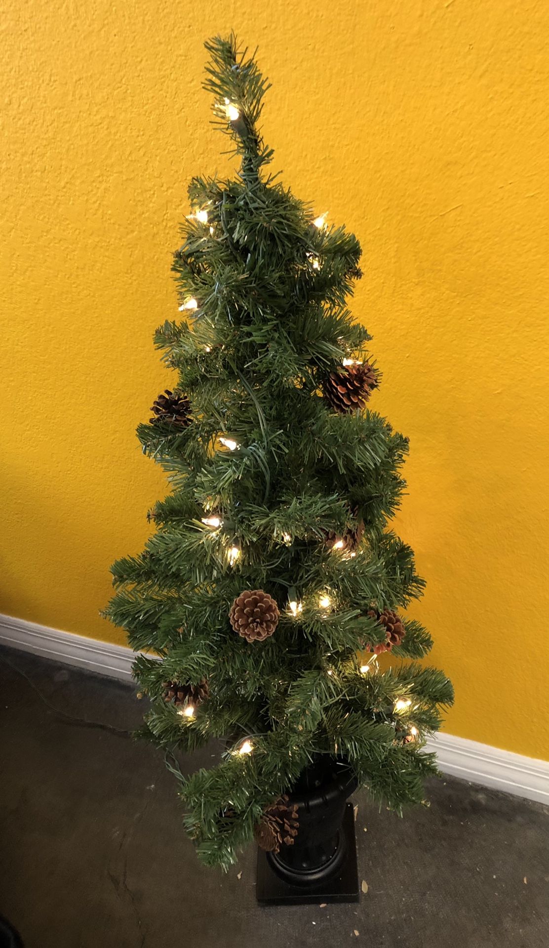 Pre-lit set of two trees. Great for entryway or other decor. 3.5’ with pine cones in decorative urns.