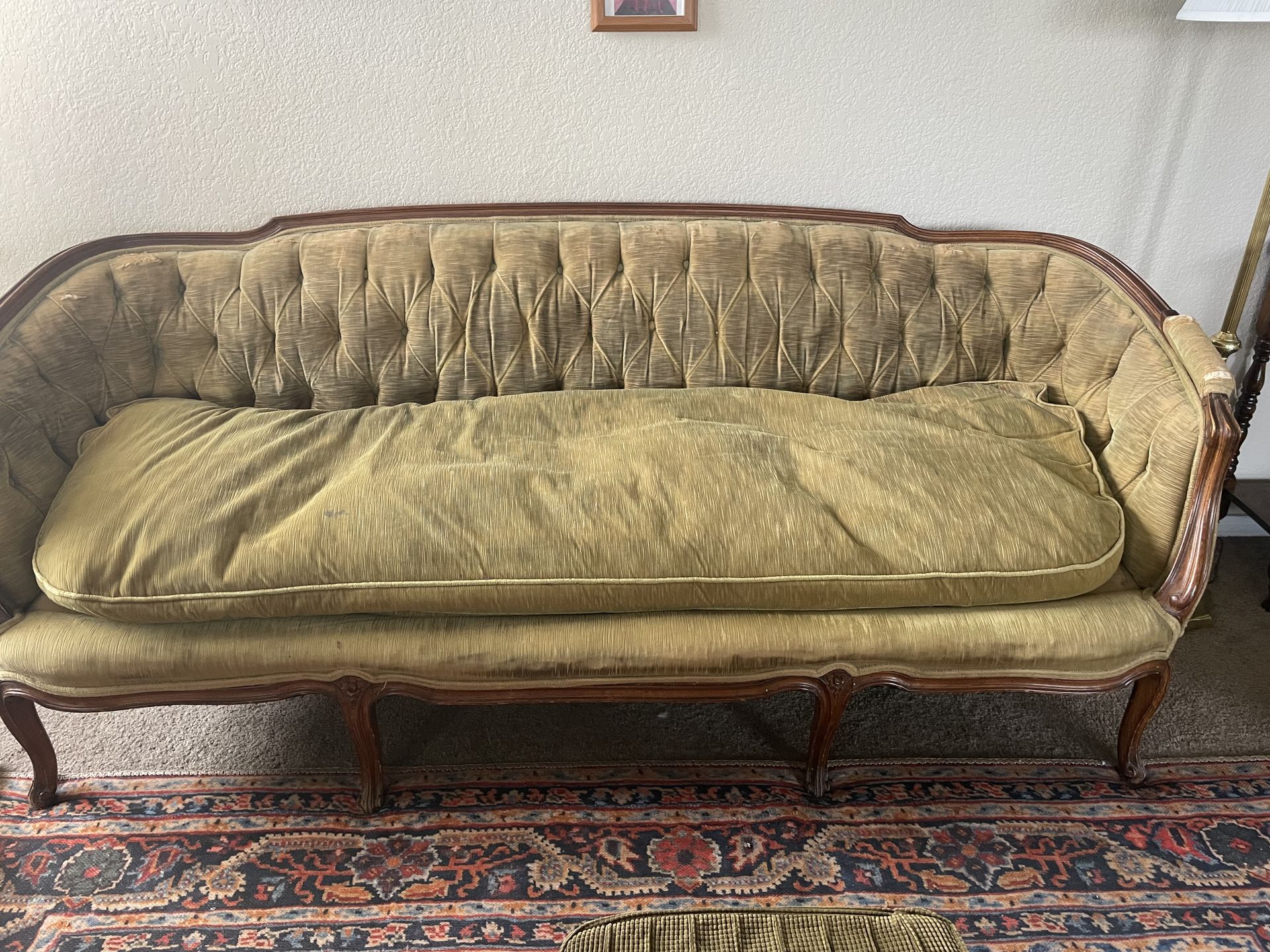 Green smooth velvet vintage couch. This is a well loved item and does come with visible wear, which is pictured above. Will go with best offer and pick up only.
