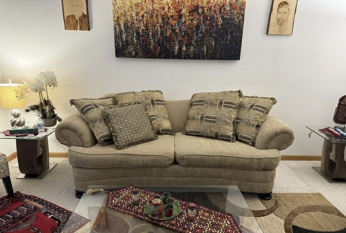 Matching sofa and loveseat set from my grandma’s house. Selling because she is upgrading to new furniture. Both pieces are in good condition and recently cleaned. From a smoke-free and pet-free home. OBO WILLING TO NEGOTIATE NO LOWBALLS PLS Loveseat: 75 Sofa: 75 Both: 100 Condition: • Cushions are full and comfortable • All legs are sturdy with only minor scuffing • Sofa has no rips or damage • Loveseat has a small zipper tear on one cushion only (does not affect use) Includes matching throw pillows. Dimensions: • Sofa: ~8 ft long, 37 in wide • Loveseat: ~6 ft long, 37 in wide Free delivery within 15 miles.