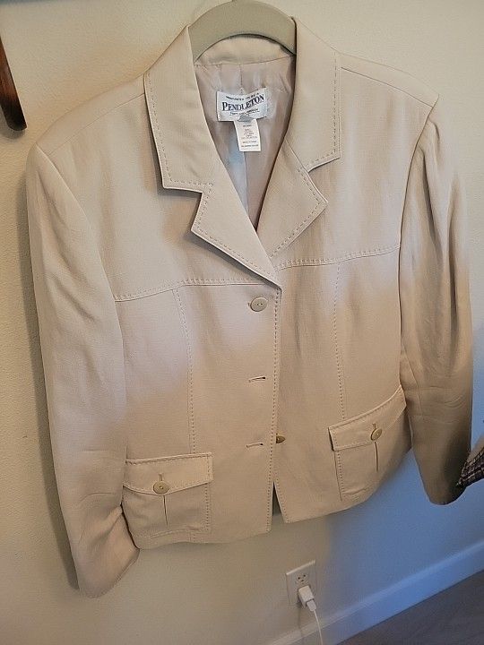 Pendleton RN 29685 Long Sleeve Tan Jacket Coat Size 10 Petite Made In USA This beautiful and stylish jacket from Pendleton is perfect for any occasion, whether it be casual, workwear, or business. Made from a luxurious blend of silk and linen, and lined with soft polyester, it is lightweight yet warm, making it suitable for winter, fall and spring. The ivory color and solid pattern make it a versatile addition to any wardrobe. With long sleeves and a collared neckline, this long coat also features pockets for added convenience. Its petite fit is perfect for those who prefer a more tailored look. This jacket is a vintage piece, made in the USA with care and attention to detail. It is sure to be a cherished addition to any collection. Pit to pit 20 in Shoulder to seam 24 in Excellent condition no rips stains or tares Smoke-free home