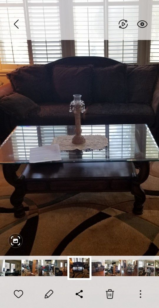Beautiful brown all wood coffee table with glass top, has a small drawer for remotes very ornate and elegant, the table is in Caldwell in my storage shed asking $100 OBO