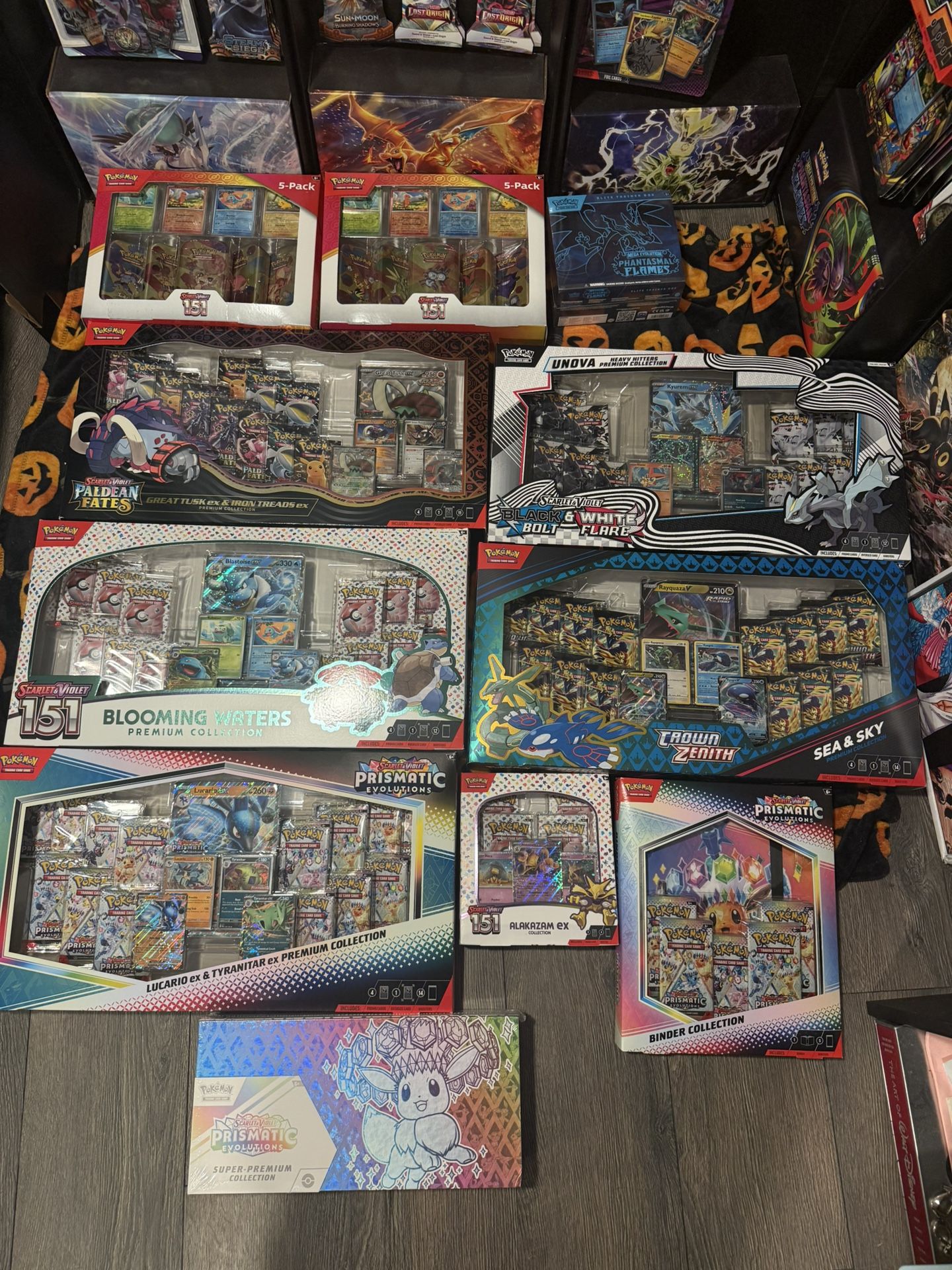 Various sealed for sale Mainly looking to SELL, I would possibly consider trades for raw at 75% Costco 151 Tins Set $300 (One box has two rips. $30 under comps because of this) SOLD Phantasmal ETB $80 151 Blooming Waters $300 Paldean Fates Premium $170 Crown Zenith Sea & Sky $260 BW Unova Premium $110 Prismatic SPC $300 Prismatic Premium $150 Prismatic Binder $80 151 Alakazam $80