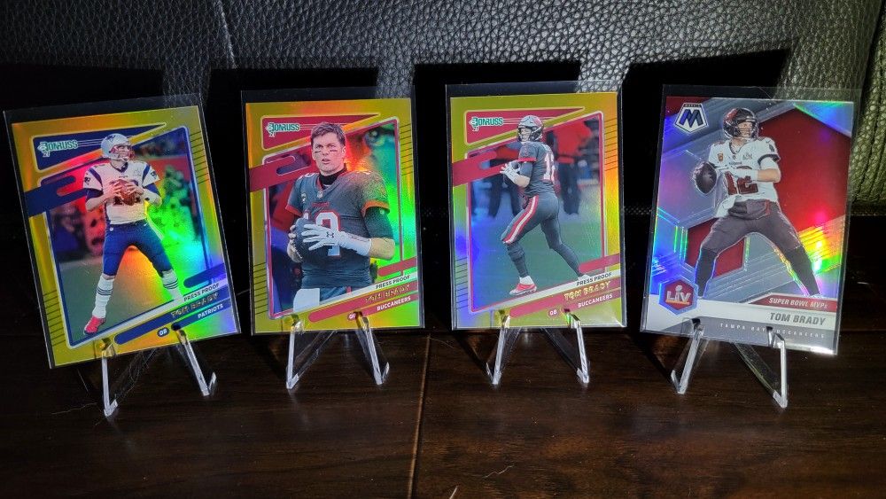 All cards pulled and sleaved. Great addition to any Tom Brady PC #1 Tom Brady Donruss gold holo press proof. Buccaneers #1 Tom Brady Donruss gold holo press proof no helmet photo variation. Buccaneers #2:Tom Brady Donruss gold holo press proof. Patriots #285 Tom Brady Mosaic Prizm silver Super Bowl MVPs Football, GOAT, quarterback, New England, Tampa Bay, trading cards, sport cards, panini, optic, select, playbook