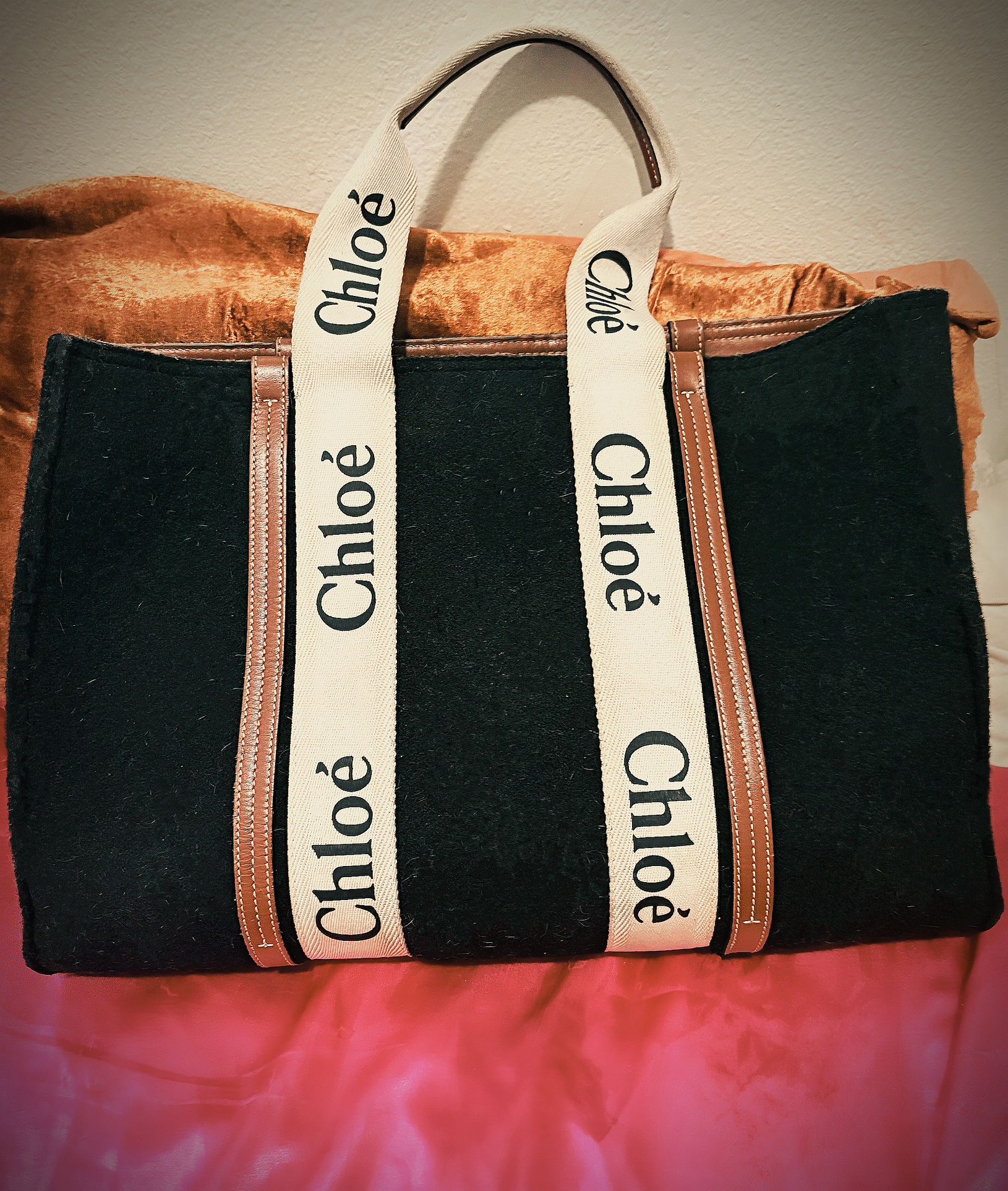 CHLOÉ Large Black WOODY WOOL TOTE