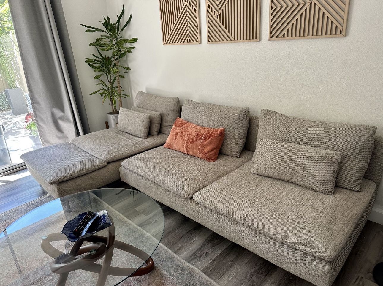 Sectional, 3 seat with chaise. Comfortable deep seats. Washable covers. Currently sold for $1,300 at IKEA. Dimensions included in photos. I can deliver π