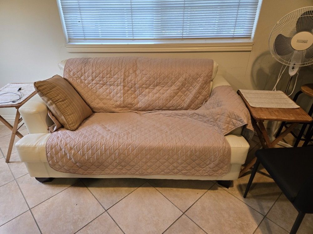 Free white leather couch/Love seat. It's starting to peel a little from the sun but looks great with the cover. Cover included. Pick up in Kirkland 39 inches depth 68 1/2 inches wide 35 inches High