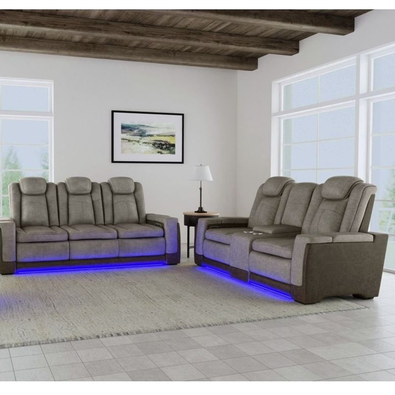 Financing available -cero interest option✅ New never used Lantana two-toned power reclining sofa with drop-down table and loveseat with console. This group features lay-flat reclining, LED lights, cup holders, wireless charging and secret under arm compartments. The additional padded seats give this group top notch comfort and style. The headrests are power adjustable and the seat directly above the drop-down table includes lights for late night work. Dimensions: Sofa - 88 x 40 x 44H Loveseat - 77 x 40 x 44H Recliner - 40 x 40 x 44H Sofa and loveseat $2,300 Sofa, loveseat and single sofa $2,500