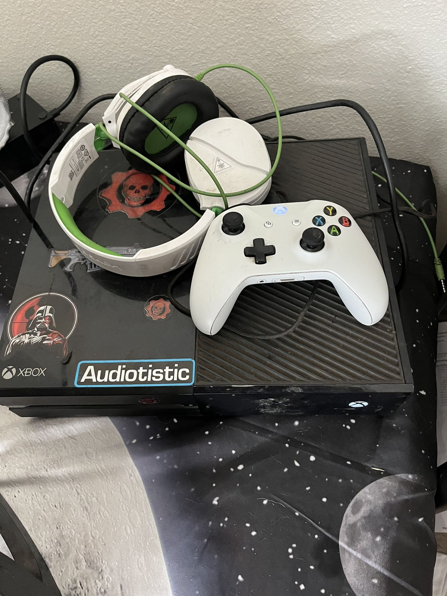 Xbox 1 plus headphones and controller. Asking 150$ for everything. Tv not included , just to show it works.