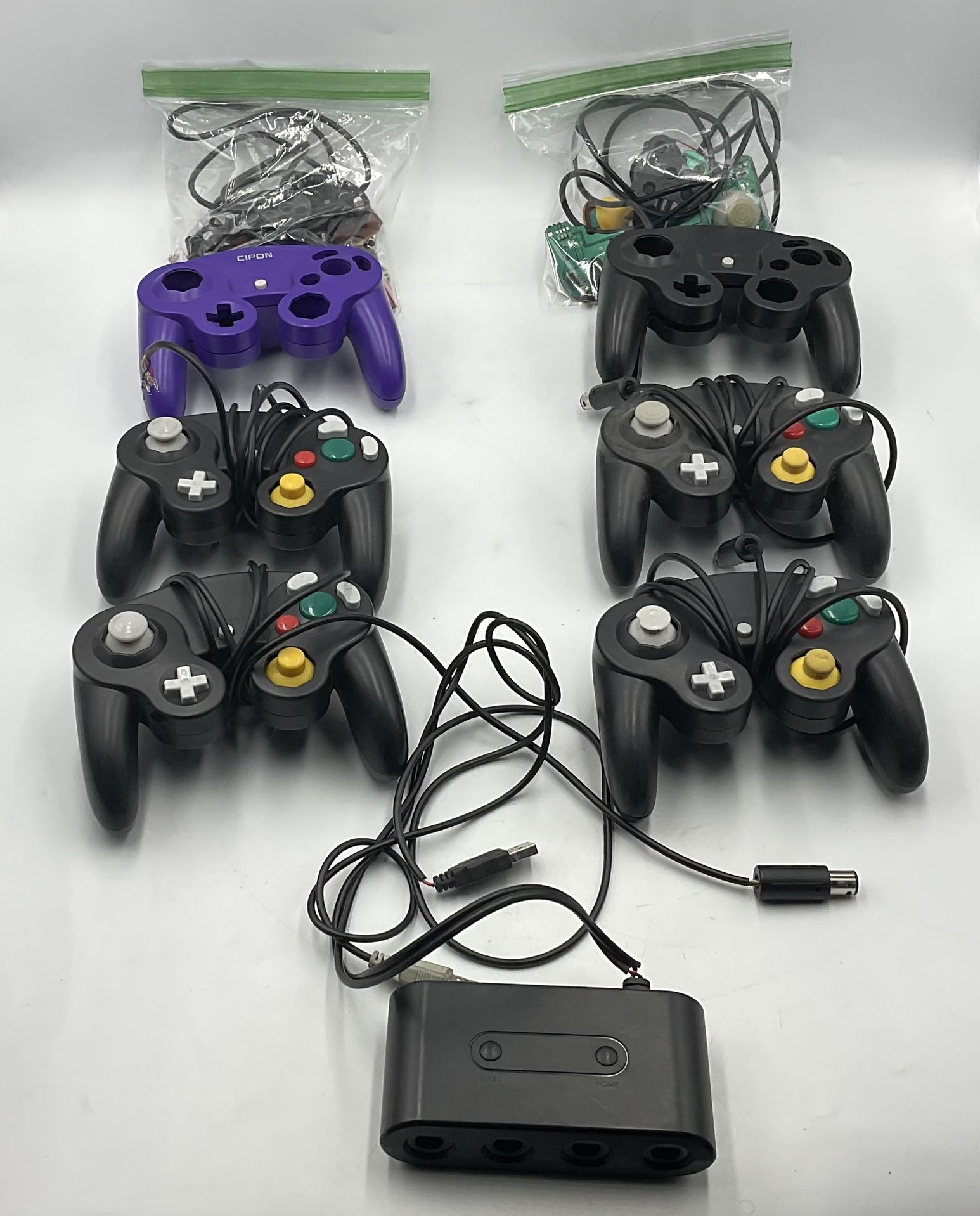 Lot of 6 Broken Nintendo GameCube Controllers And Adapter (For Parts/Repairs). NOTHING WORKS!!! Wires are stretched, and the controllers and adapter don’t work with systems (tested on a Nintendo Switch). 2 Controllers are completely disassembled, and I didn’t feel like putting them back together. The pieces are in the bags behind them. The Black Disassembled one actually still works, except the joystick has major drift. Inspect pictures closely, and message me if you have questions. Item is as shown in picture. Thank you 4 shopping at Sam McBargains. We enjoy doing business with you. Please give a five star rating if you enjoyed our product.