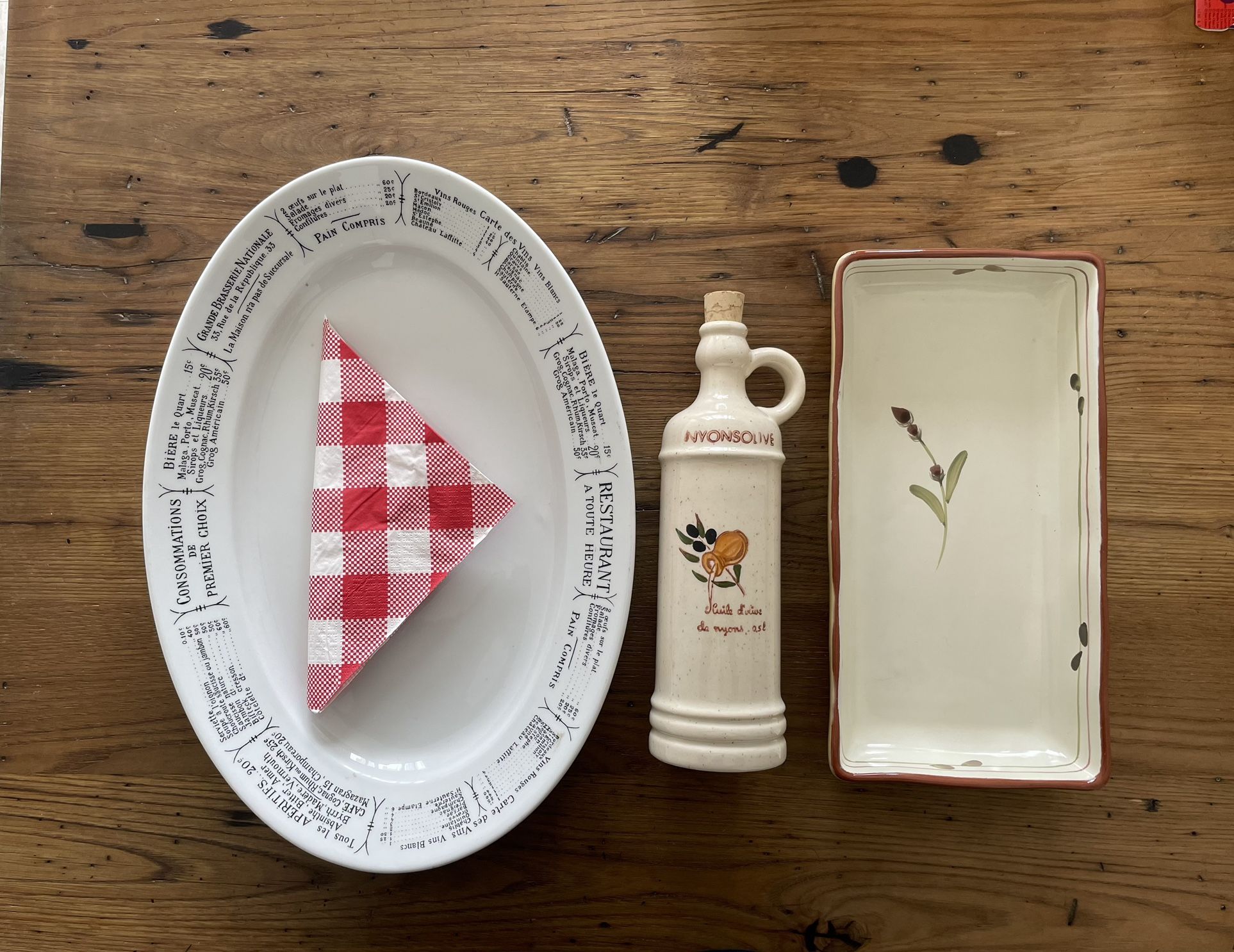 Pillivuyt Brasserie Collection Porcelain Platter 15” long, 10.5” wide Provence Rustic Olive Branch Tray w/terra cotta bottom 11.5” long, 6” wide, 1.5” high Vintage Olive Oil dispenser from Nyons France 9.5” high, 3” diameter Pickup: River North Cash only