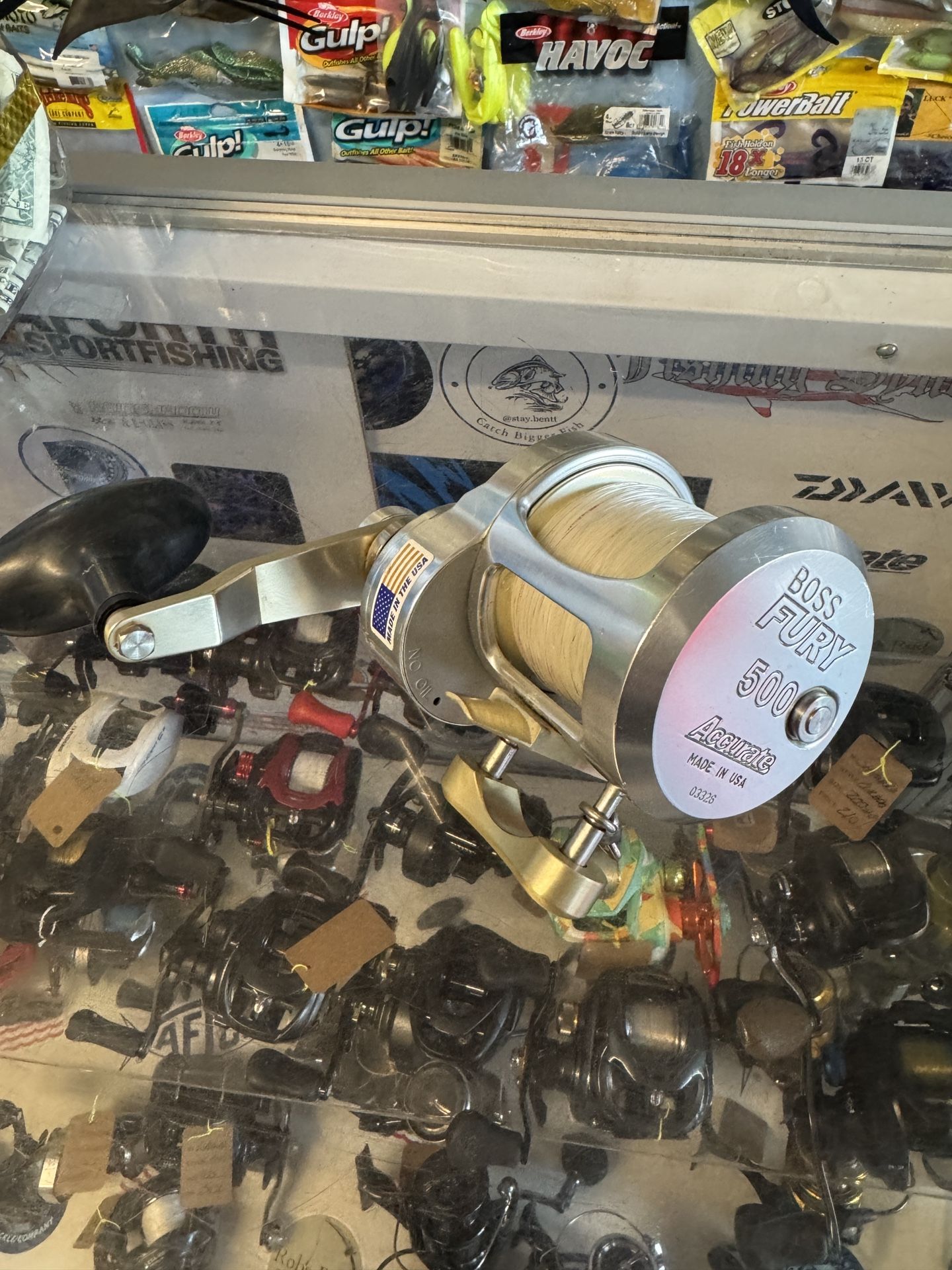 Accurate BOSS Fury 500 4:1 Baitcast Reel | eBay The Accurate Fury 500 2-speed (FX2-500) is a powerful conventional reel featuring a 6.1:1 high gear ratio and a 3.1:1 low gear, offering 45"/23" of line per crank, weighing around 20 oz, and boasting a 24lb max drag, built with stainless steel gears, ABEC-5 bearings, and Accurate's DirecShift system for versatile inshore/nearshore fishing. Here are the key specs for the Accurate Fury FX2-500: Performance & Mechanics Model: FX2-500 Gear Ratios: 6.1:1 (High) / 3.1:1 (Low) Line Retrieve (IP/Crank): 45" (High) / 23" (Low) Max Drag: ~24 lbs Bearings: 4+1 ABEC-5 stainless steel ball bearings Anti-Reverse: Stainless steel anti-reverse bearing Internal Components: 17-4 heat-treated stainless steel gears and shaft for increased torque. Drag System: Calibrated lever drag with a twin drag system for even pressure. Physical Weight: ~20 oz (varies slightly by source, some list FX2-500N at 18oz) Spool: Sleeved design for better free-spool. Line Capacity (Approximate) Braid: ~475 yards of 50lb test. Mono: ~300 yards of 25lb or 30lb test. Key Features DirecShift 2-Speed System: Instant engagement/disengagement of the low gear with a push-button. XCT Control: Centrifugal casting control. CVX Technology: For a strong, lightweight frame. Power Arm Handle: For increased leverage. This reel is designed for versatility, handling tasks from casting to jigging with its powerful low gear and fast retrieve high gear Located in Murrieta. Serious buyers only. Let’s not waste anyone’s time. Lots of rods and reels in stock. We buy sell and sometimes trade up fishing gear. Shipping is a possibility. See our listings for more tackle rods and reels. Make an appointment to come by and say hi. All gear is final sales. Ignore; Fishing, Fishing Tackle, Fishing Rod, Fishing Reel, Fishing Gear, Fishing Lures, Fishing Repair, Fishing Combo, Fishing Rod Blank, Fishing Line, Fishing Rod Custom, Fishing Guides, Fishing Tip, Spinning Rod, Spinning Reel, Baitcaster, Baitcaster Rod, Okuma, Penn, Stik, Shimano, Penn, Daiwa, Kencor, Seeker, Avet, Seigler, Trolling Rod, Trolling Lure, Trolling Reel, Two Speed Reel, Jigging Reel, Fenwick, Calstar, Roddy, Jig Stick, Shakespeare, Berkeley, Pfluegers, Rail Rod, Winn, Fuji, Custom Rod, Fishing Weights, Lews, Abu Garcia, Zebco, Truline, Phenix, Swimbaits, Conventional Rod, Conventional Reel, Newell, Fin-Nor, Jigging Rod, Live Liner Reel, Kastking, Yo-Zuri, Zoom, Gulp, Bass Lures, Jigs, Tackle Box, Yum, Rainshadow, phenix avet accurate newel gloomis tady salas kickers turners Shimano Gulp, Bass Lures, Jigs, Tackle Box, Yum, Rainshadow, phenix avet accurate newel gloomis tady salas kickers turners shimano daiwa okuma fishing reel rod torium makaira trinidad proteus tackle line braid lures jigs saltwater saltist kastking baitcaster freshwater bass spinning spinner jerkbait crankbait senko worms catfish dough trout largemouth small mouth tuna yellow tail barracuda flyline hooks sinkers mono boat Catalina clemente island terminal tackle Rigs hooks weights torpedoes united Avet Seeker Calstar Rainshadow Composites bait jig Daiwa Accurate Penn Trinidad Torium Newell Okuma Powerpro Rapala Talica Tranx fluorocarbon Phenix Shimano Loomis Gamakatsu Lamiglas Abu Garcia Axis Talica Okuma Tiburon owner ringed hooks seagaur power bait gulp spro yo-Zur