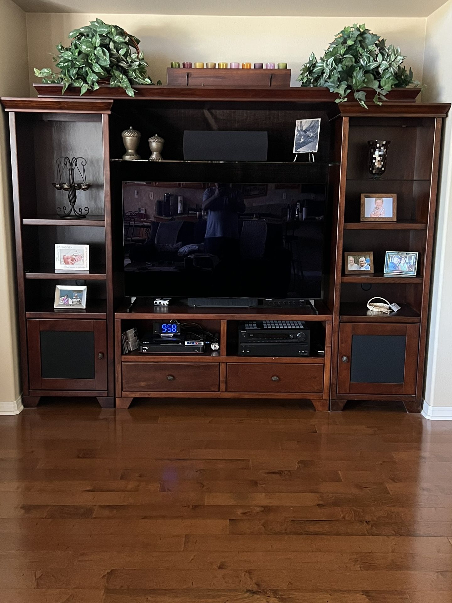 Espresso finish on Birch 4 piece plus custom heavy glass shelf. Center console is 52”Wx 24”Hx 19”deep. Side Cabinets (2) are 22” -24.75 wide at top with crown molding, 72” H X 16.5 D. Overall unit across top is 98” Includes bridge as shown. Cash only, you pick up in San Marcos.