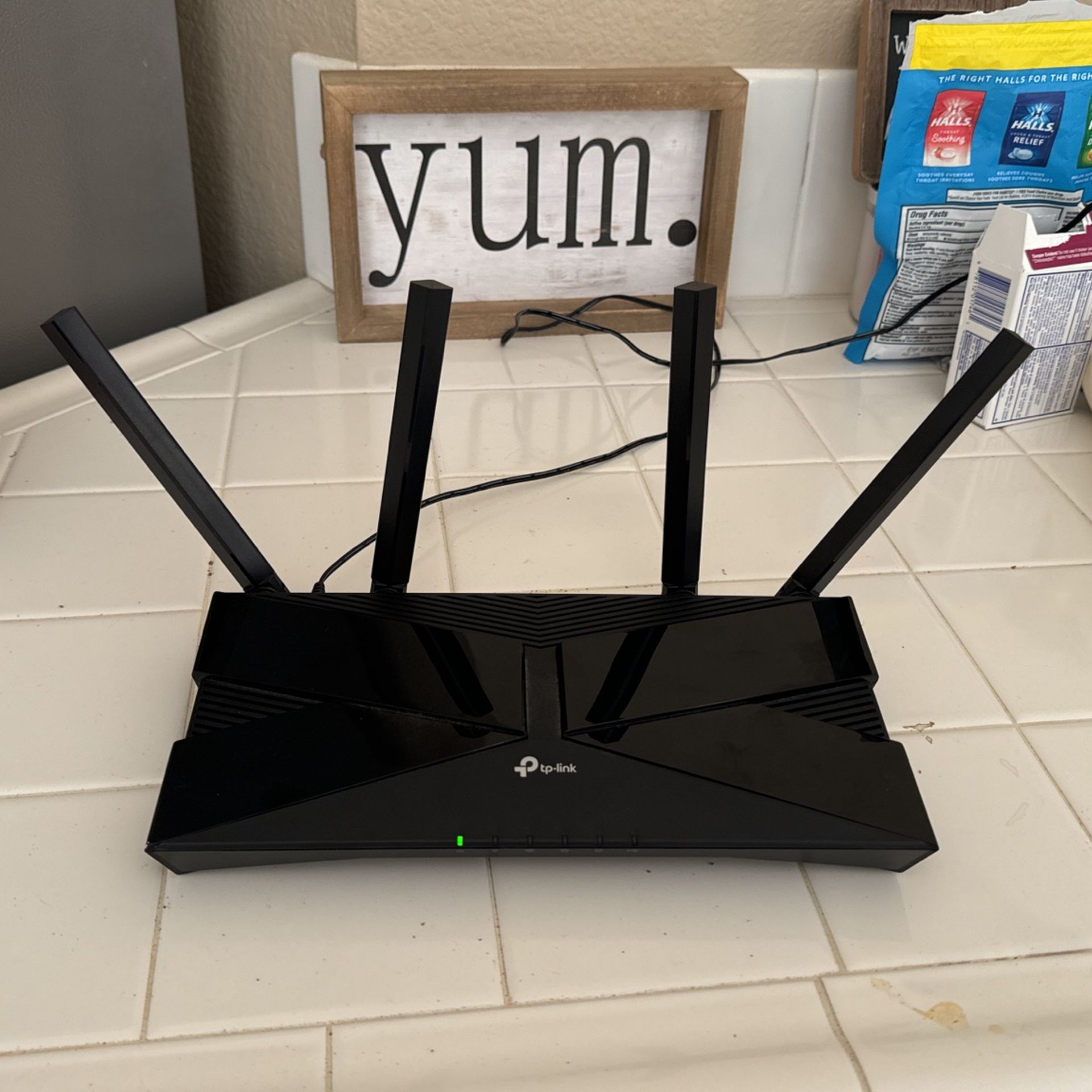 Like new. TP Link AX3000 WiFi 6 router. I Just upgraded to a mesh system. Highlights Wi-Fi 6 Technology: Wi-Fi 6 technology achieves faster speeds, higher capacity, and lower latency compared to the previous generation of Wi-Fi 5.[1] [2] Dual-Band Speeds: Reaches speeds up to 3 Gbps (2402 Mbps on 5 GHz band and 574 Mbps on 2.4 GHz band) for faster streaming and gaming.[1,5] Connect More Devices: Simultaneously communicate more data to more devices using revolutionary OFDMA technology.[3] More Reliable Coverage: Achieve the strongest, most reliable WiFi coverage with Archer AX3000 as it focuses signal strength to your devices using Beamforming technology and 4 antennas. Increased Battery Life for Devices: Target Wake Time technology reduces your devices' power consumption to extend their battery life.[4] Easy Setup: Set up your router in minutes with the powerful TP-Link Tether App.