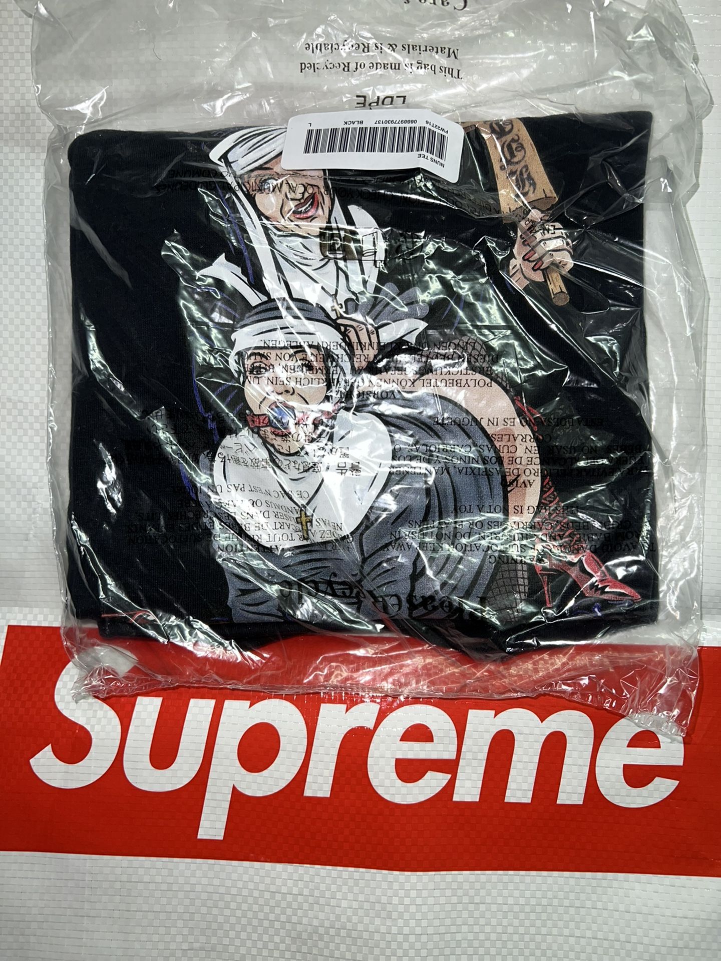 Supreme Nun Tee black shirt hoodie box logo hat camp cap jacket shoulder waist puffy bag deck sb s m l
