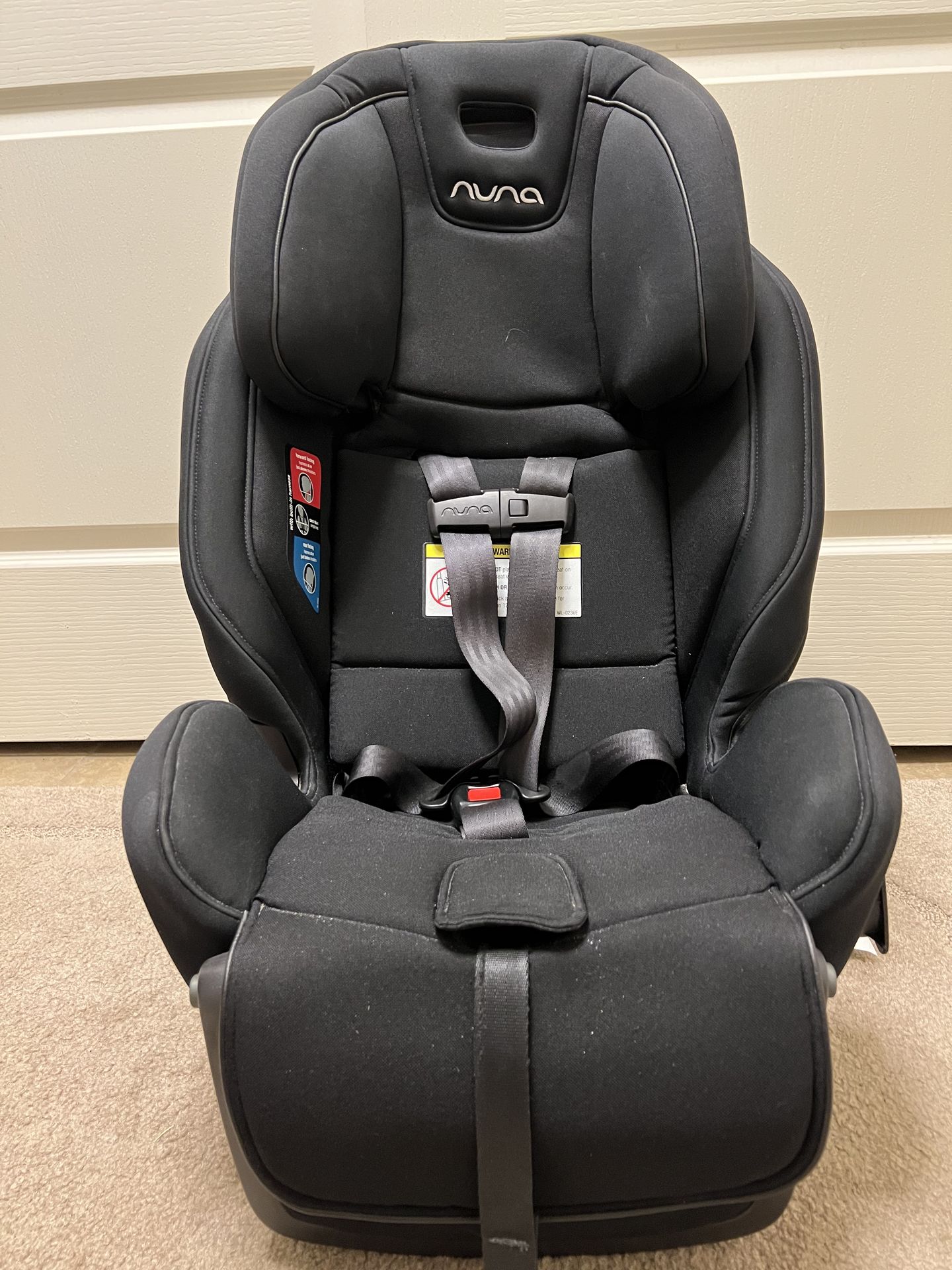 Nuna EXEC next Black Caviar All-in-One Convertible Baby Car and Booster Seat Smoke, Accident, and Pet free. Manufactured 2019/08/03 Model number; CS093O0CVR Rear-facing convertible: 5–50 lbs. with seatbelt; 5–35 lbs. with lower anchor belt; 18"–49" Forward-facing convertible: 30–65 lbs. with seatbelt; 30–40 lbs. with lower anchor belt; 34"–49" Belt-positioning booster: 40–110 lbs. and 43"–57", suggested use 4 years+ All-steel frame with reinforced belt path for superior protection Moisture-wicking polyester fabric for all-season comfort; leatherette accents 4 rear-facing and 4 forward-facing bubble-free recline angles Simply™ secure hassle-free installation for confidence every single time No-rethread 5-point harness adjusts as they grow and stores inside the seat for booster mode Slim design fits 3 across in most mid-sized vehicles Spacious 3" cup holders are removable, washable and designed to fit sippy cups and big-kid water bottles FAA-certified in harnessed modes Energy-absorbing foam and Aeroflex™ Side Impact Protection (SIP) pods Colored belt path indicators for easy and accurate seat belt routing 12-position height-adjustable headrest and 2-position adjustable crotch buckle; 2" additional legroom for both rear-facing and forward-facing riders Anti-rebound panel extends 2" to provide additional legroom for rear-facing riders Machine-washable fabrics No added fire retardant chemicals Imported
