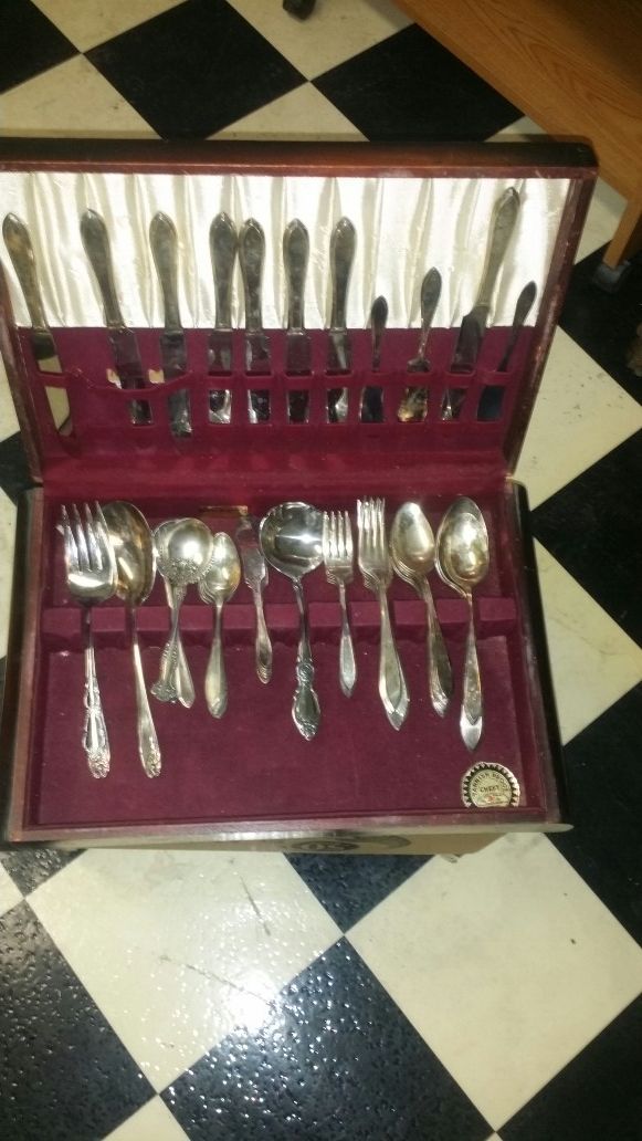 55 piece set WM Rogers I S Silver plated flatware silverware in hard wood case. Will include silverware polishing stuff if I can find it :-)