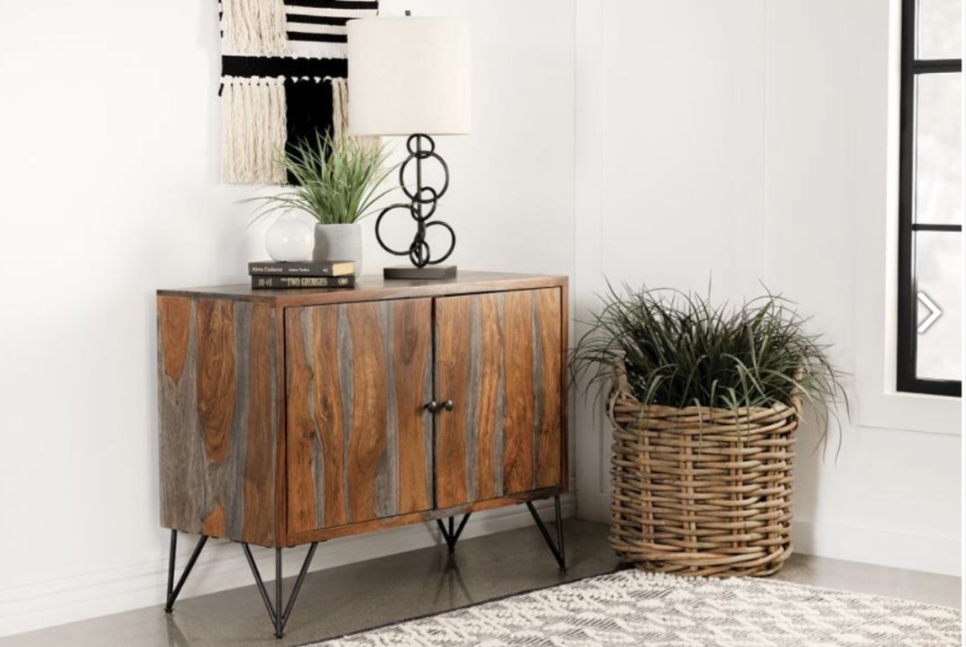 Rustic accent cabinet for modern bohemian spaces. Slender gunmetal iron legs add a mid-century modern touch. Spacious interior for storage. Made from Sheesham wood, brown and gray tones with black iron legs. One adjustable shelf and iron knobs. Measurements on photos . Delivery & assembly available. Visit our store at The Oaks Mall 390 W. Hillcrest Drive Thousand Oaks, CA 91360 Open daily: Mon- Sat 10am-8pm & Sun 11am-6pm