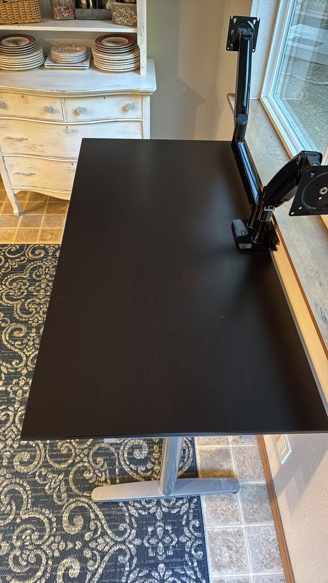 IKEA office-grade desk needs a new home. Great condition with now dents or scratches. There are two light areas in the middle. The silver legs are height adjustable. The top is a dark black/brown color. It could be detached if you wanted to put a different top on it as the frame it substantial. The monitor arm is available separately. Size: 68” x 31.5” Top is 5/8” thick