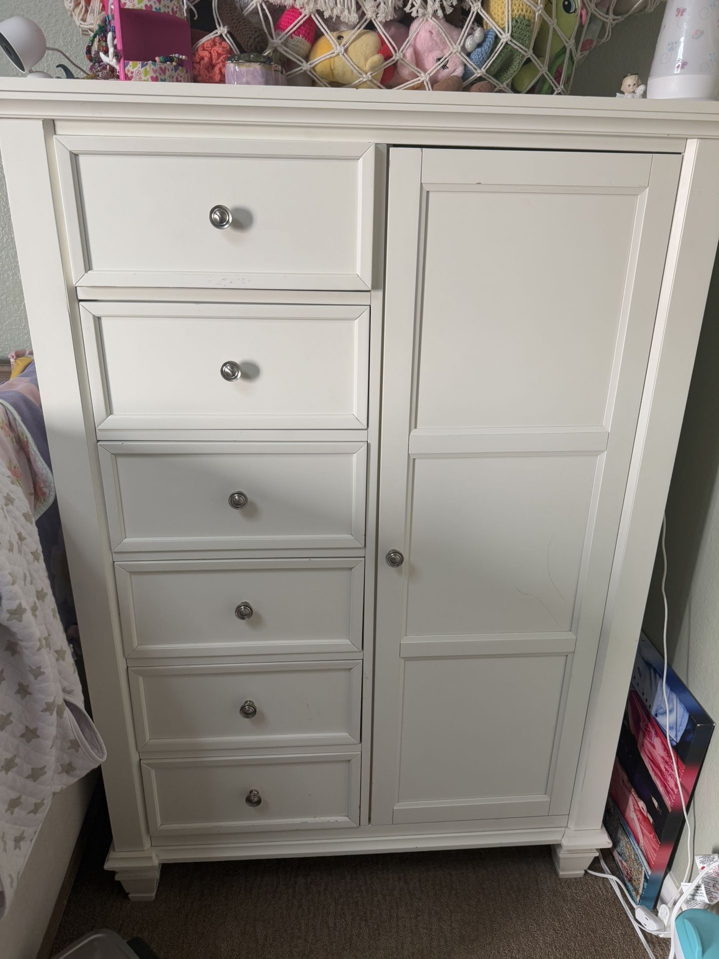 8 drawer white tall dresser Three shelves 18.5 inches length 42 inches width 60 inches height