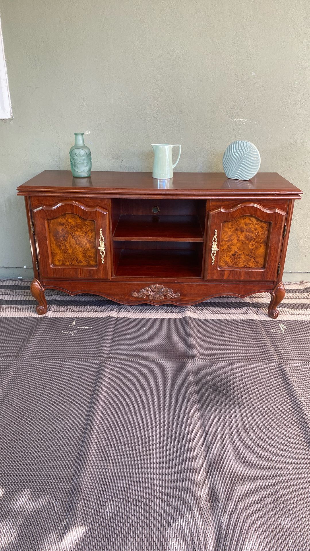 French provincial style tv stand, entryway way or decorative. Handle are painted gold. Measure 48” inches wide, 16” deep, 26.5 tall.
