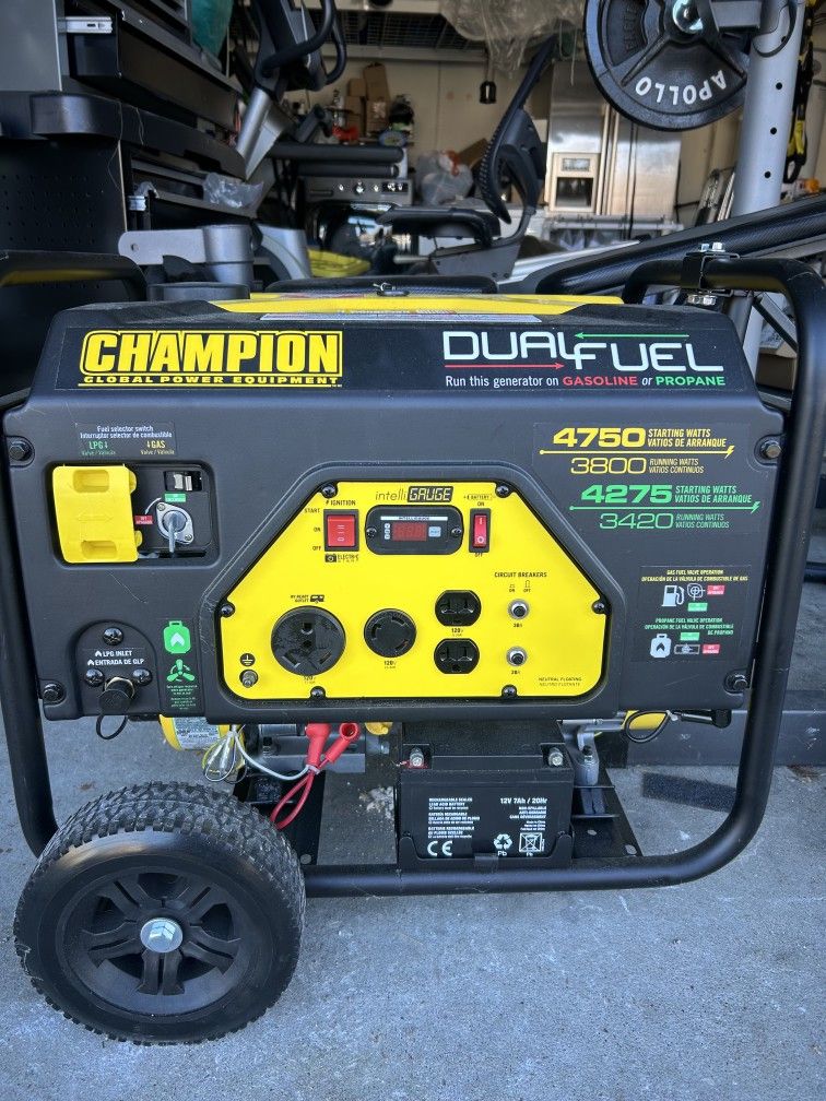 ⚡ NEW / NEVER USED – Champion Dual Fuel Generator (Gas or Propane) ⚡ Brand new Champion Dual Fuel portable generator — never used, never run under load. Purchased as a backup and never needed. Specs & Features: Brand: Champion Power Equipment Dual Fuel: Runs on gasoline or propane Gas: 4750 starting watts / 3800 running watts Propane: 4275 starting watts / 3420 running watts Electric start with battery IntelliGauge (volts, frequency, hours) Multiple outlets incl. 120V & 30A Heavy-duty frame with wheels Trusted, reliable brand Condition: ✅ Never used ✅ Stored in garage ✅ Clean, like new Perfect for: Emergency home backup RVs & camping Job sites⚡ NEW / NEVER USED – Champion Dual Fuel Generator (Gas or Propane) ⚡ Brand new Champion Dual Fuel portable generator — never used, never run under load. Purchased as a backup and never needed. Specs & Features: Brand: Champion Power Equipment Dual Fuel: Runs on gasoline or propane Gas: 4750 starting watts / 3800 running watts Propane: 4275 starting watts / 3420 running watts Electric start with battery IntelliGauge (volts, frequency, hours) Multiple outlets incl. 120V & 30A Heavy-duty frame with wheels Trusted, reliable brand Condition: ✅ Never used ✅ Stored in garage ✅ Clean, like new Perfect for: Emergency home backup RVs & camping Job sites Storm preparedness Storm preparedness