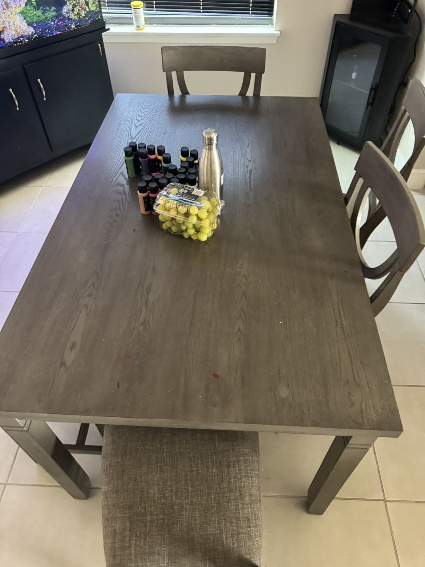 Dining table set with 4 chairs and a bench! Great condition overall — just a little paint on it (see photos). Should come right off with polish remover!
