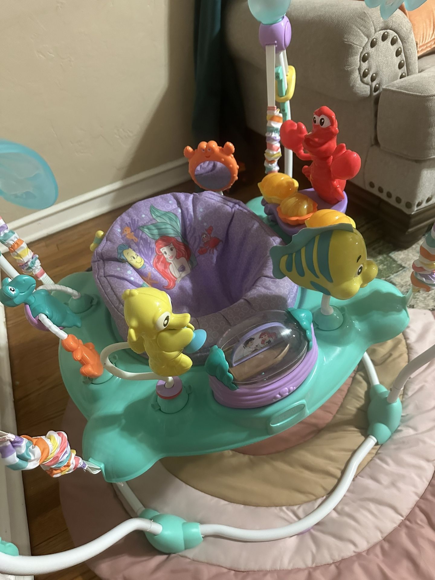 New little mermaid baby bouncer. Bought new on Amazon a few months ago. Baby used like twice. All toys intact, like new! Located in central