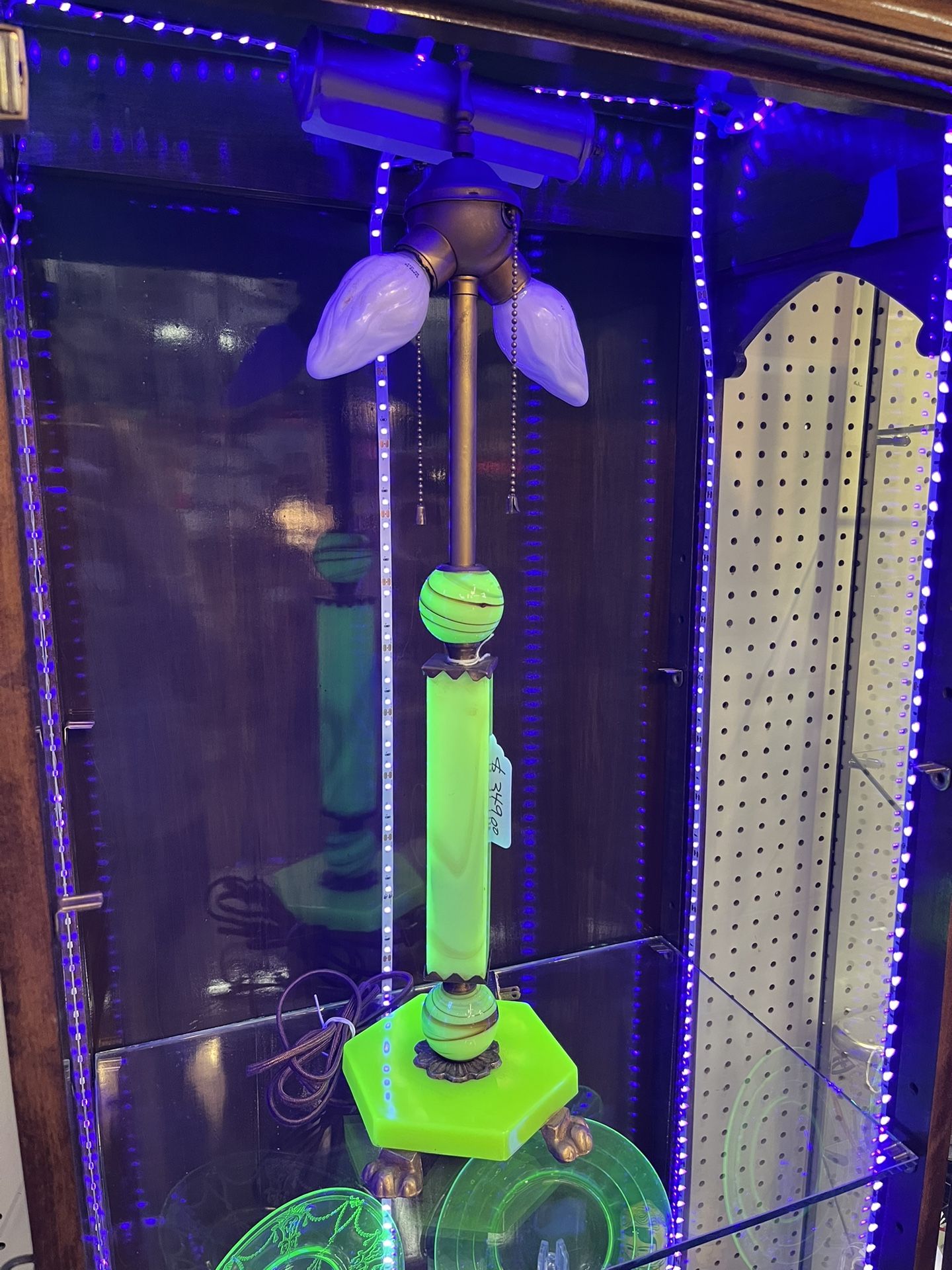 Very nice 25” tall jadeite uranium glass table lamp. This can be found in booth H1. See photos for location and other info.