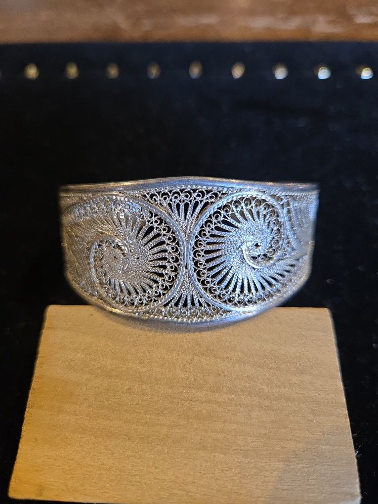 S.Michael Designs Artisan Crafted Filigree Cuff Silver Bracelet It is hand-crafted in .925 silver. The cuff is 30mm at its widest point and tapers to 15mm at the gap. The intricate filigree design features a distinctive swirling pattern. S. Seem Antiques 100 S. Chestnut Street Bath, PA 18014 Open 7 Days A Week