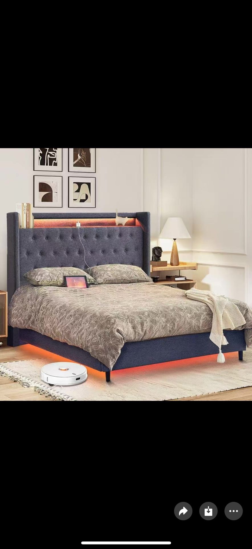 New in box Queen Size Platform Bed Tufted Upholstered Bed Frame with 48.4" Tall Wingback Headboard, LED Lights, Charging Station, Wooden Slats, No Box