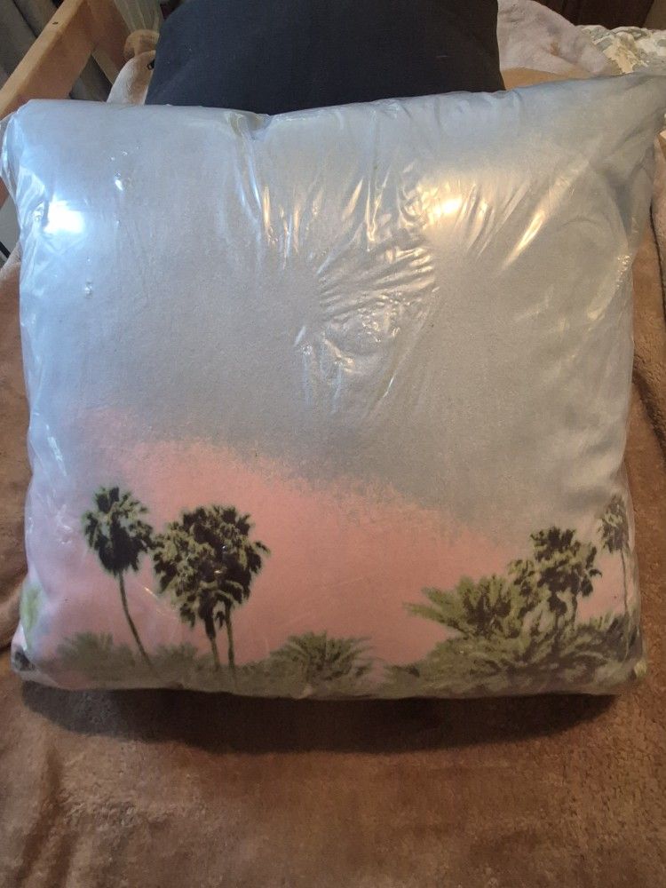 Palm Tree / Sunset decorative pillow. 13 x 13 inches. NEW in plastic. Has been in storage for a while. $5.00