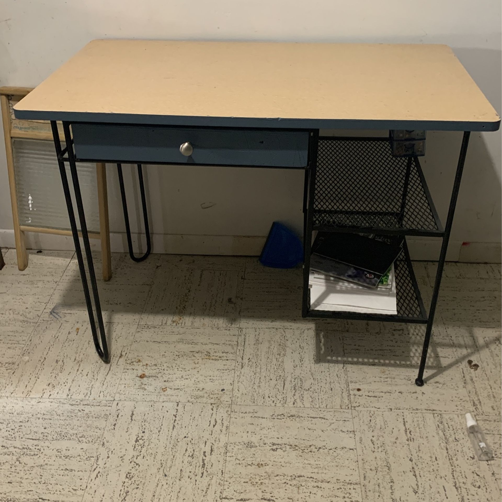 Good desk, good for small office. Has some scratches on drawer. 40 inches long 2 feet wide 29 inches tall