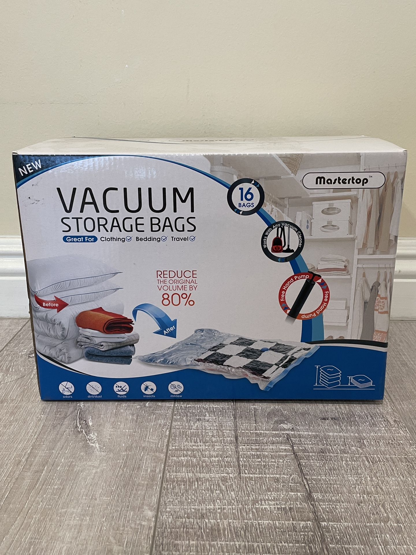 Vacuum Sealer Compression Storage Bag Organizer, Hand Pump Included (16pcs Pack) Brand New in SEALED BOX Space Saver Bags for Clothes Comforters Blankets Pillows Total: 16pcs Bags * 2pcs × X-Large(48"×36") * 4pcs × Large (40"×28") * 4pcs × Medium (32"×24") * 6pcs × Small (24'×16") * See images for sizes reference. * Come with Hand Pump ** Wholesale available