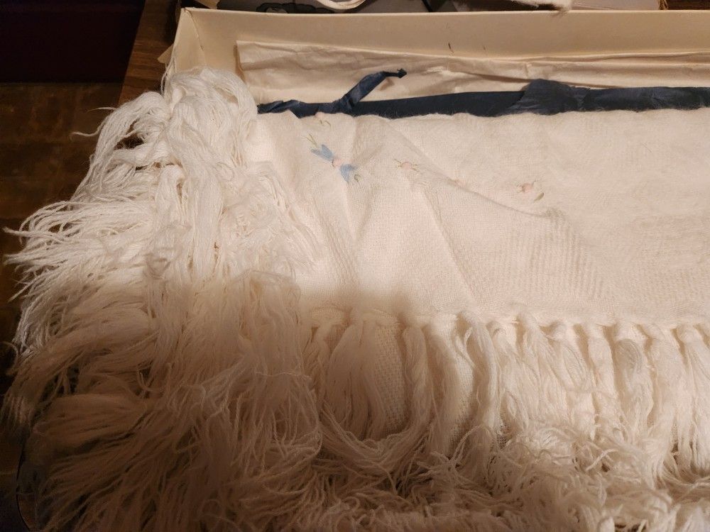 2 piece gown, a light jacket, 3 bonnets, and a soft white blanket.