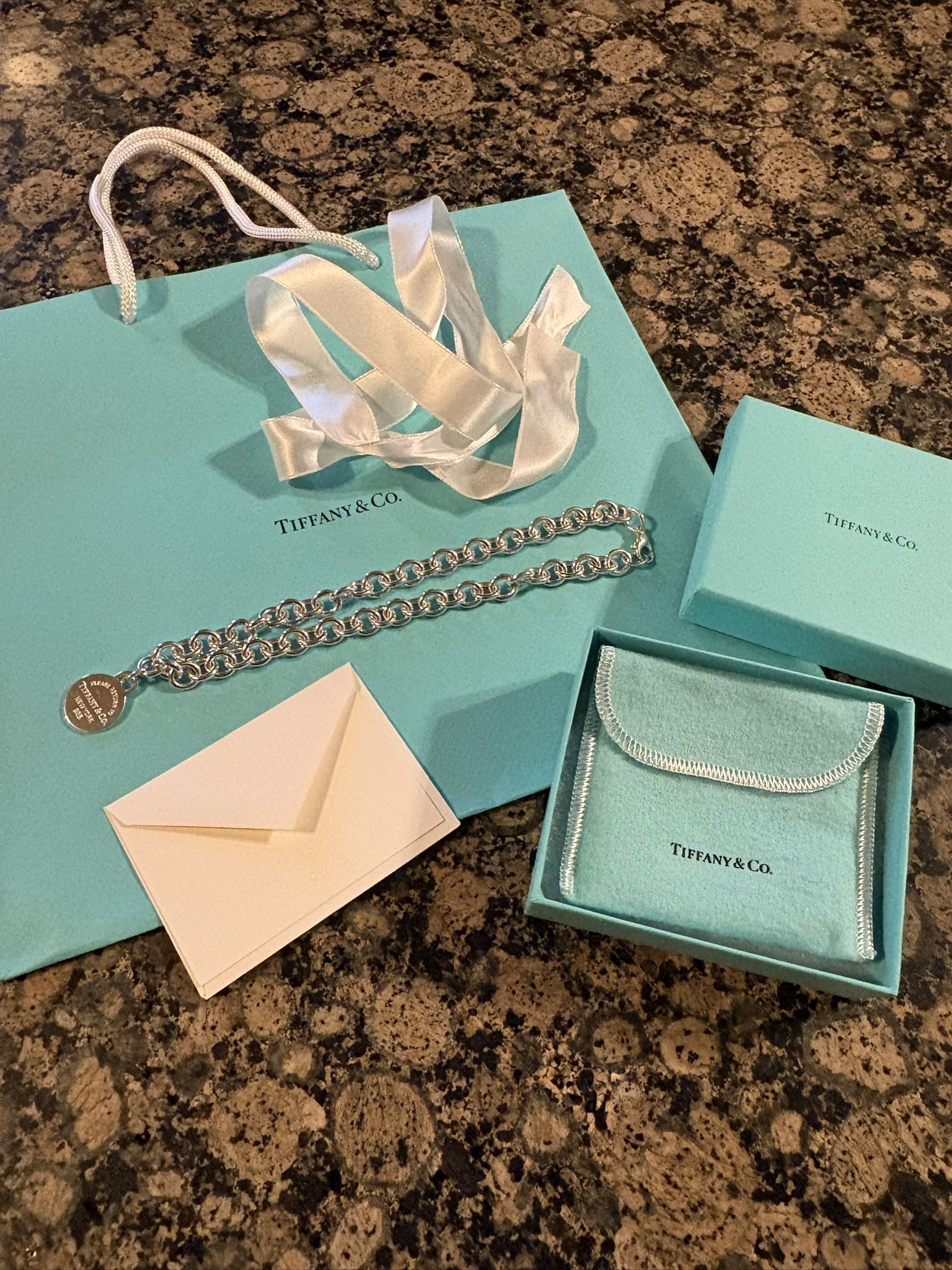 This is an authentic classic Tiffany & Co Item. Tiffany hallmarks engraved on front and back of charm. Beautiful piece of iconic jewelry!! This is a 16-inch necklace from Tiffany & Co.'s Return to Tiffany collection. The necklace features a round tag pendant made of sterling silver with the Tiffany & Co. signature engraved on it. The pendant hangs from a round link chain with a lobster clasp closure. This comes with box, bow, pouch and a signature card. This has never been worn but had some tarnish on it because it's silver. I polished it to restore that. Some hairline scratching from polishing. THIS ITEM COMES FROM A PET AND SMOKE FREE HOME. PICK UP WILL TAKE PLACE AT ROCKY RIVER POLICE STATION!!