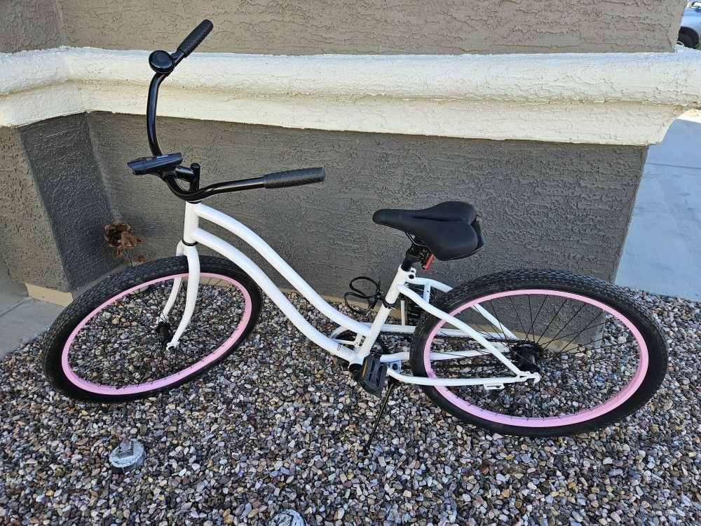 Unbranded cruiser bike, similar to Phat Cycles Sea Wind style. Perfect for casual riding Brand new seat installed. Frame and gears are near brand new and in excellent condition. 26in tires, 22in step over height. Includes bike bell and rechargeable headlight!
