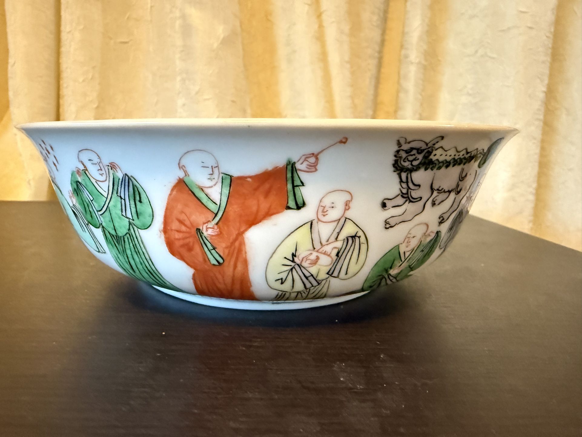 For sale is antique Chinese Export Porcelain bowl with decoration of eighteen Lohans . It is about 7" wide, 2.5" tall. It is delicately painted central Buddha and exterior with a continuous frieze depicting the ‘Eighteen Lohan’ in five-colored enamel on-glaze. Iron-red enamel KangXi reign Mark on underside of base. There are Several chips and crack lines on the edge but it still displays beautiful.