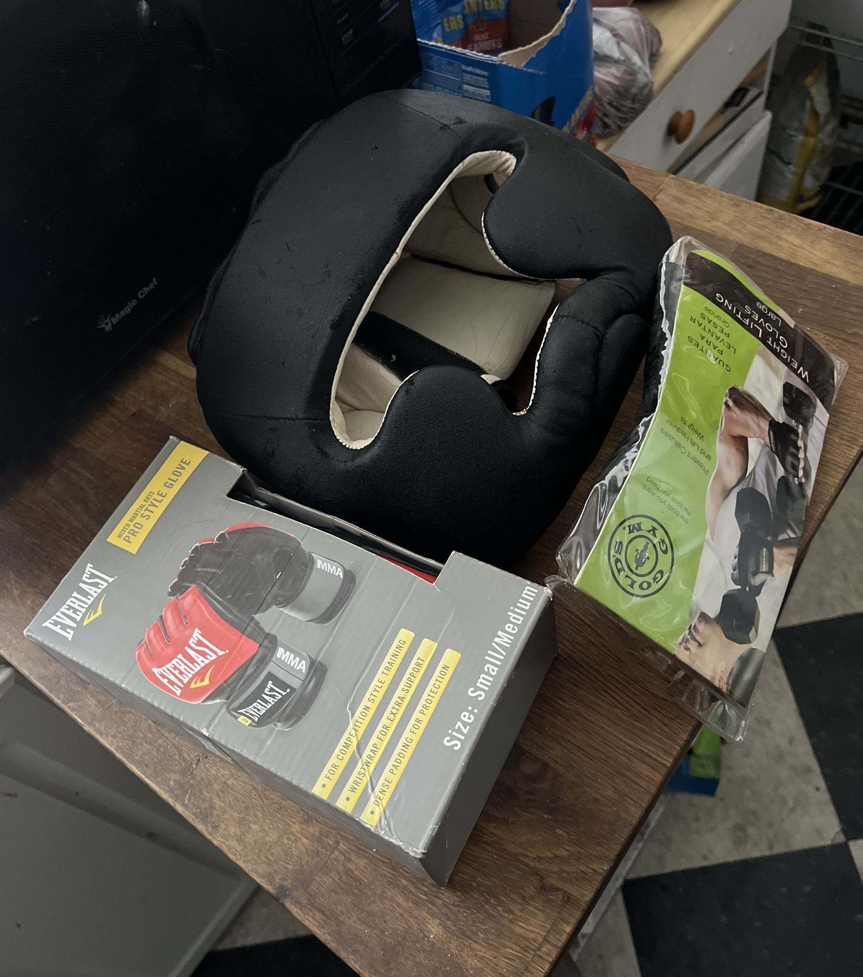 Awesome Gear in great condition, my son only used a couple times before he outgrew everything and had to get a new gear. RevGear PRO SPAR HEADGEAR - BLANK size: small new is $65, then the Everlasting Mixed Martial Arts MMA Pro Style Gloves 4.0 oz. size: small/medium new is $30, then Gold’s Gym Weight Lighting Gloves Large new is $20. These are the cost of these before taxes. So passing this onto the next boy or man to save some money while learning to spare and fight.