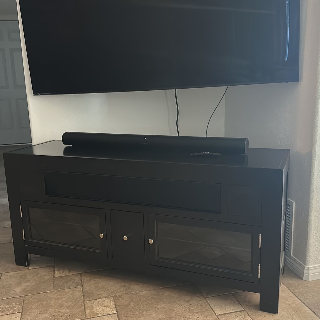 Beautiful black wood TV entertainment system with multiple storage areas for components CDs, DVDs, and extras. Perfect for putting a very large TV on top of or storing all of your goodies underneath. In very good shape. Paid 450. Priced to sell quickly!