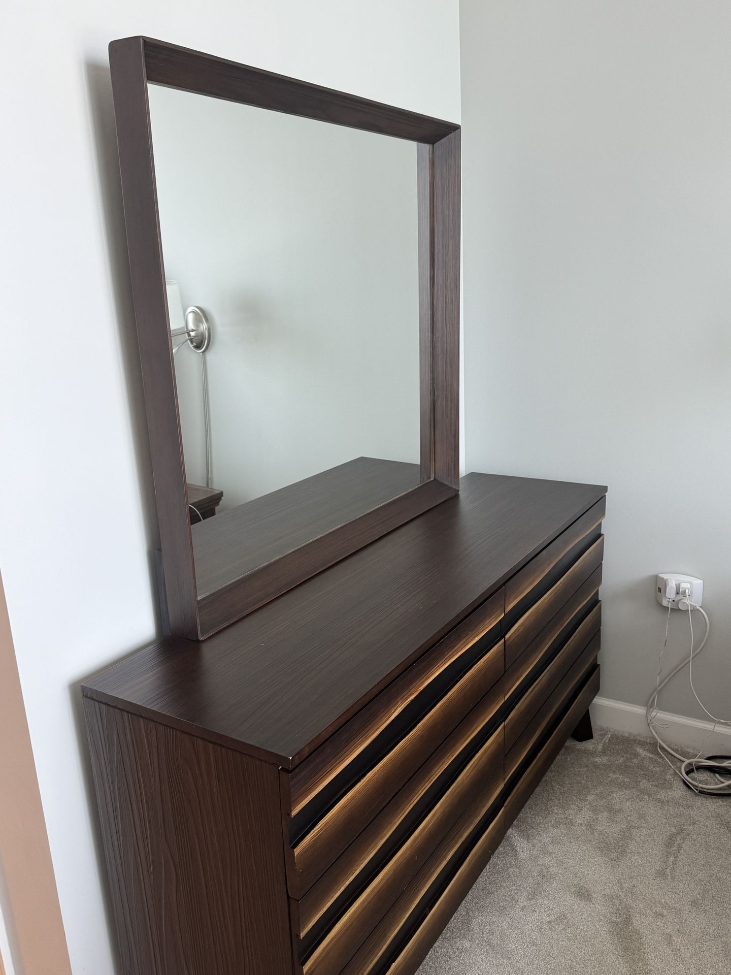 Modern dresser with mirror, solid pine wood has 6 large drawers. Pickup in south loop Dimensions: Dresser: 60 Length x17 Depth x31 Height inches Mirror: 40x40 inches (attaches to back of dresser)